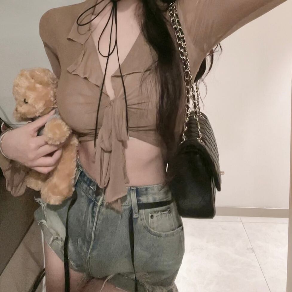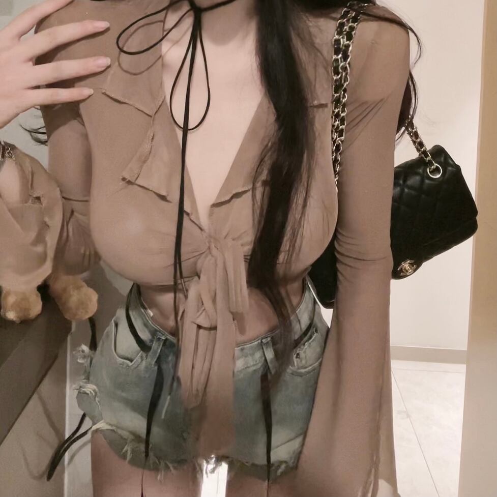 シースルークロップドシャツ シアーボレロシャツ レディース トップス シャツ ブラウス ミニ ショート クロップド丈 クロップドシャツ ミニシャツ シアーボレロ シースルーシャツ Vネック 襟付き 長袖 フレアスリーブ ベルスリーブ シースルー シフォン 透け感 シアー かわいい 大人可愛い きれいめ カジュアル おしゃれ かっこいい こなれ感 ガーリー エレガント キュート デート お出かけ アウトドア イベント 休日 ショッピング フリル 重ね着 インスタ映え フェミニン
