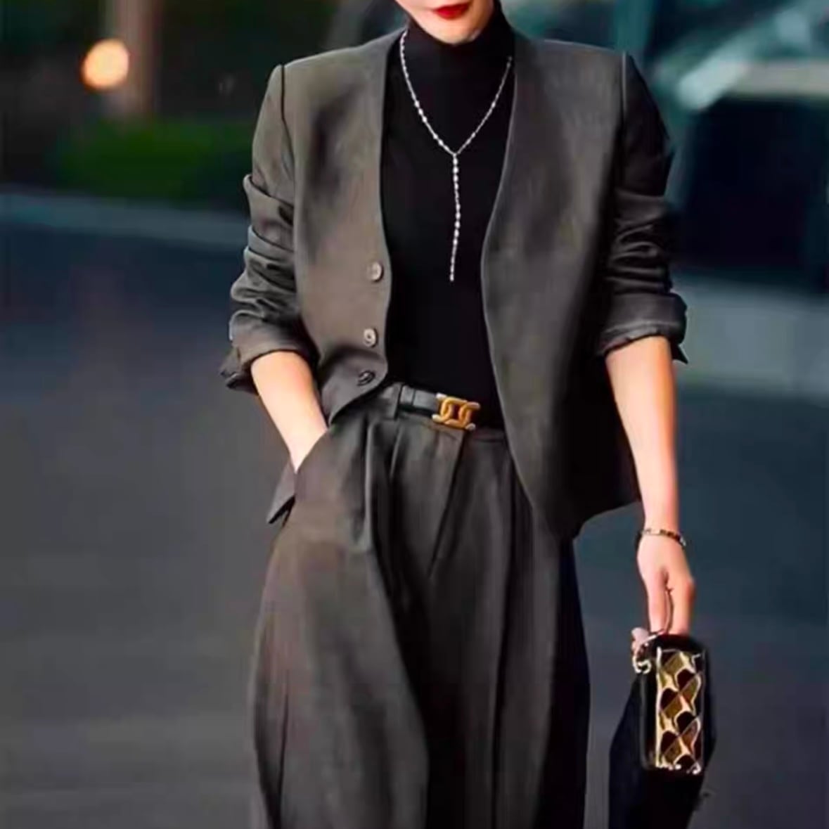 ハイウエストのパンツと、長袖ジャケットの2点セットで、上下揃えてコーディネートに悩むことなく、すぐにおしゃれをお楽しみいただけます。