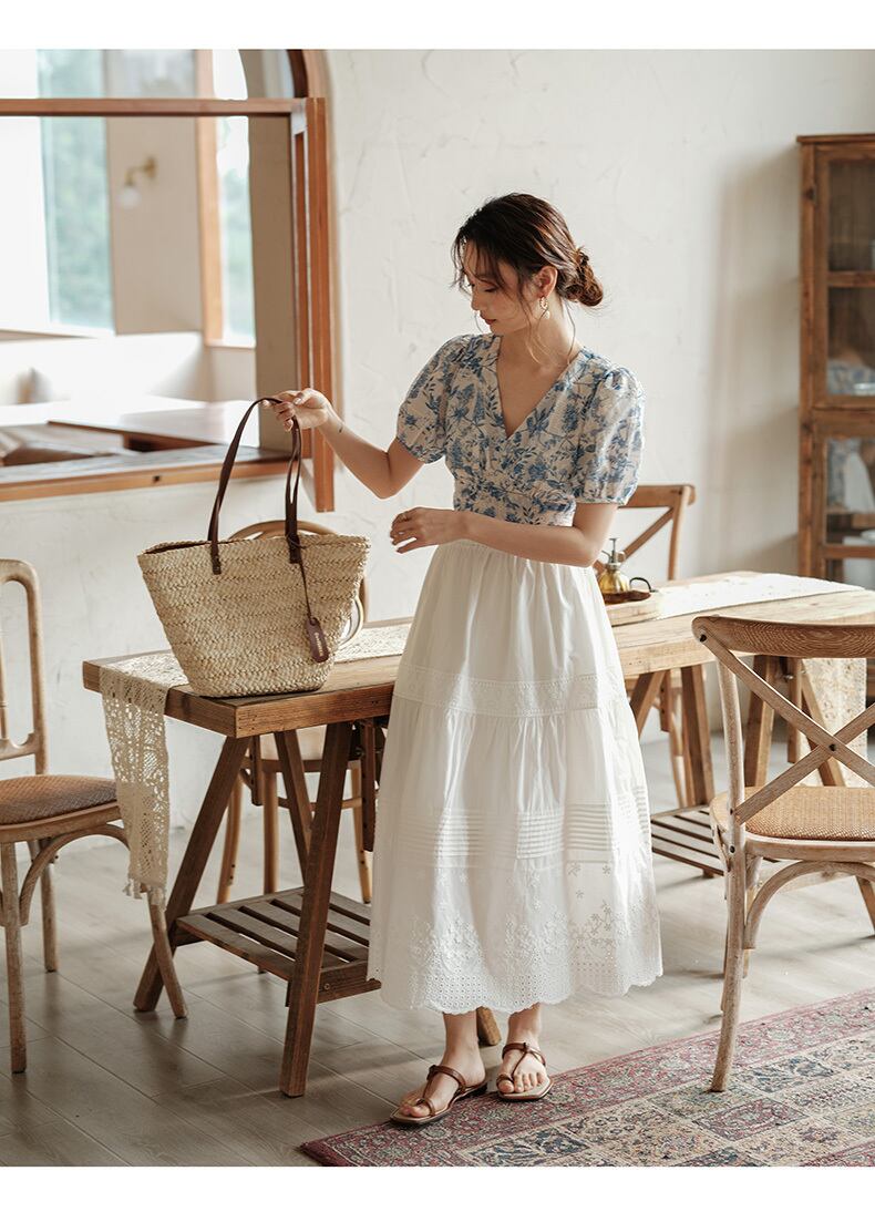 細身のシルエットに刺繍とバックリボンが施され、ガーリーかつエレガントな印象を与えます。