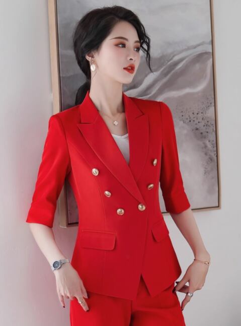 2セット セットアップ レディース ジャケット パンツ ボトムス 前開き テーラードジャケット ストレートパンツ ロングパンツ フルレングス 5分袖 襟付き タイト スリム 細身 ストレート ポケット ボタン きれいめ 上品 おしゃれ かっこいい レトロ クール エレガント 存在感 フォーマル かっちり 都会的 無地 春 夏 会議 MTG ミーティング プレゼン ママ オフィス ビジネス OL 通勤 体型カバー 美脚 脚長 清楚 S M L XL 2XL 3XL 4XL 白 ホワイト 黒 ブラック レッド