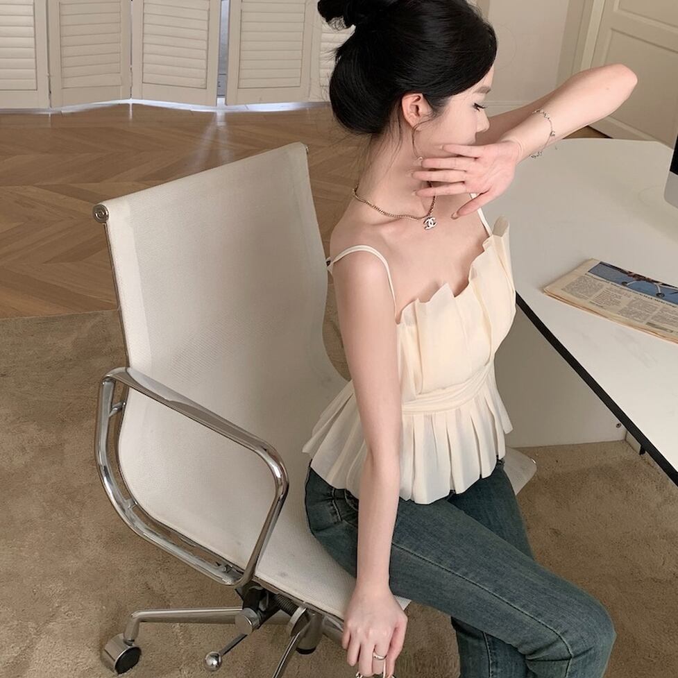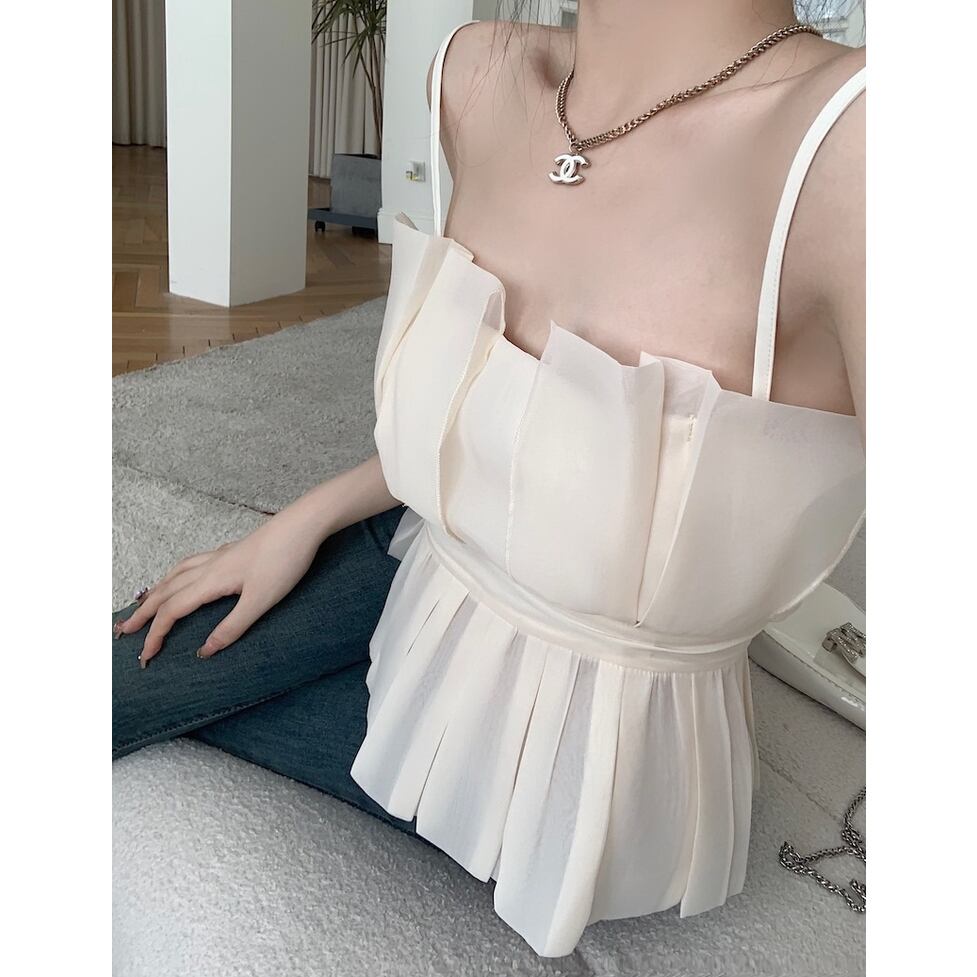 シアーなタックプリーツが可愛くてフェミニンなペプラムキャミソール。エレガントな雰囲気を引き立てるドレスのような表情にシフト。大人の甘さを加算することで緊張感をゆるめるのに効果的。オシャレの完成度を高めるカギに