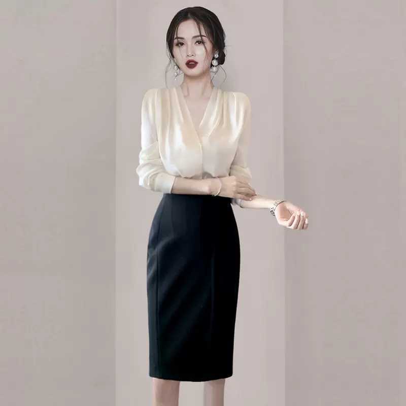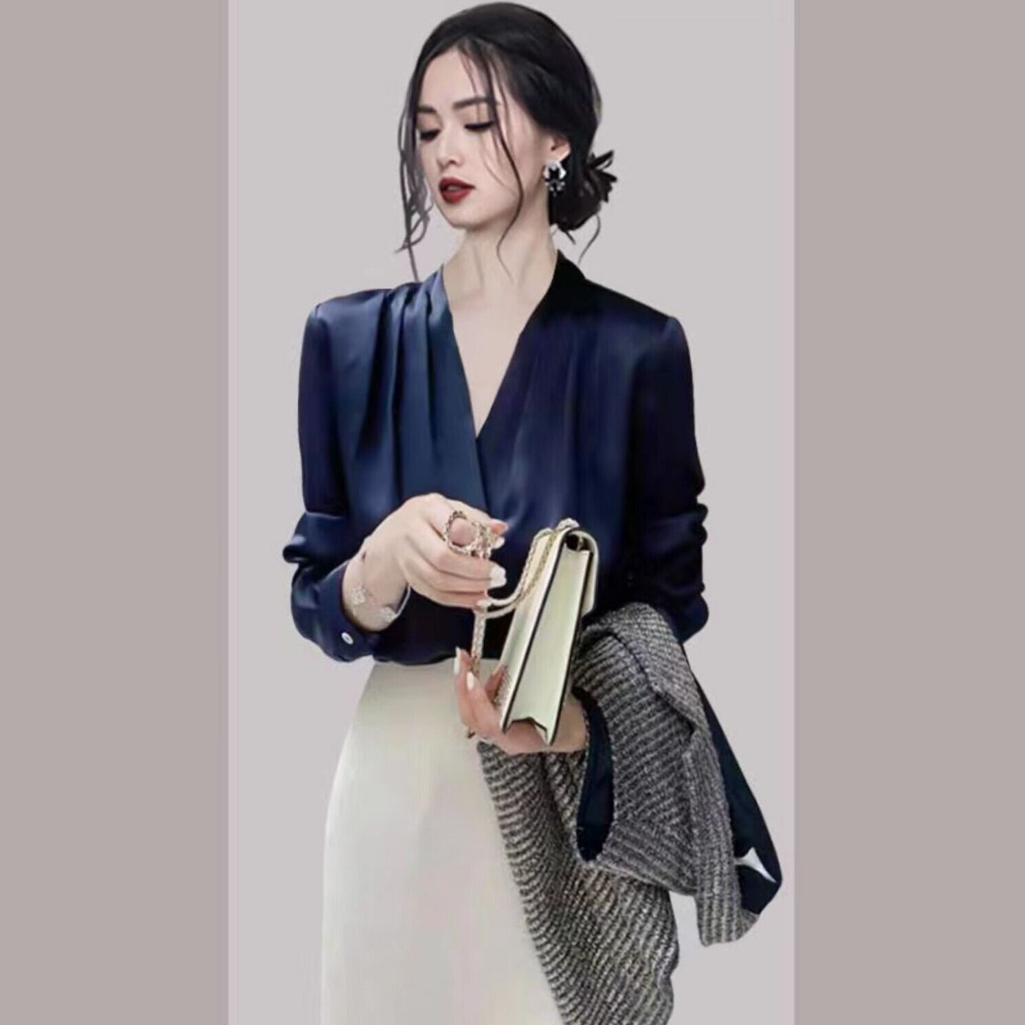 シンプルでエレガントなデザインの、レディースVネックブラウス。