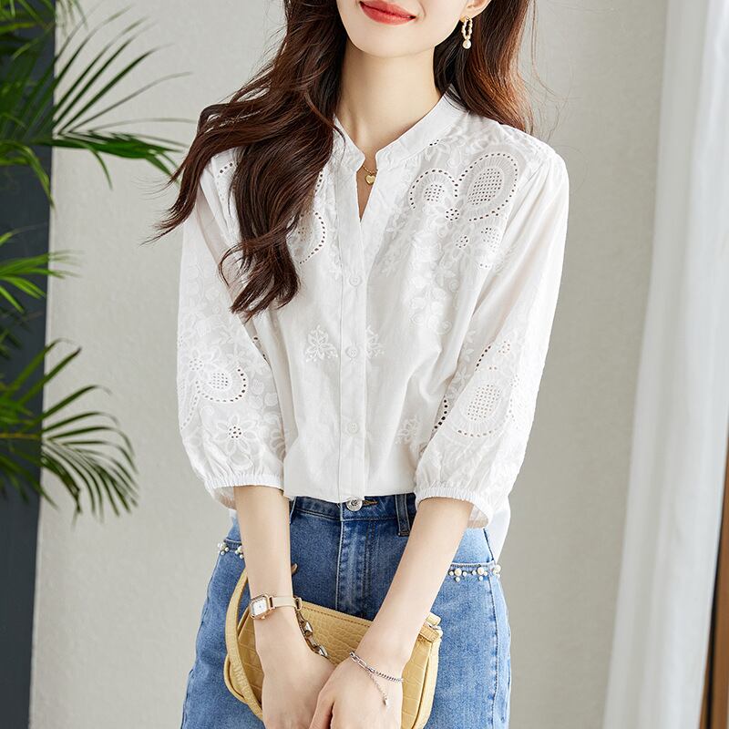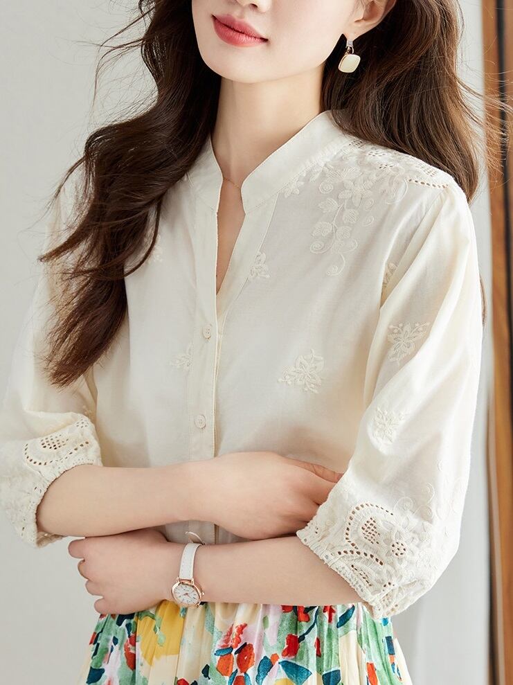 花柄 パンチングレース 立ち襟 七分袖 シャツ ブラウス レディース トップス 丈長 ミディアム 7分袖 襟付き スタンドカラー フェミニン レース 刺繍 透け感 かわいい 大人可愛い きれいめ シンプル カジュアル 上品 おしゃれ ガーリー エレガント 花柄 フラワー 春 夏 秋 ママ 通勤 学生 学校 デート お出かけ 旅行 公園 女子会 休日 ショッピング カフェ 普段使い 着回し M L XL 2XL 3XL ゆったり 白 ホワイト アプリコット ネイビー スカイブルー ライムグリーン