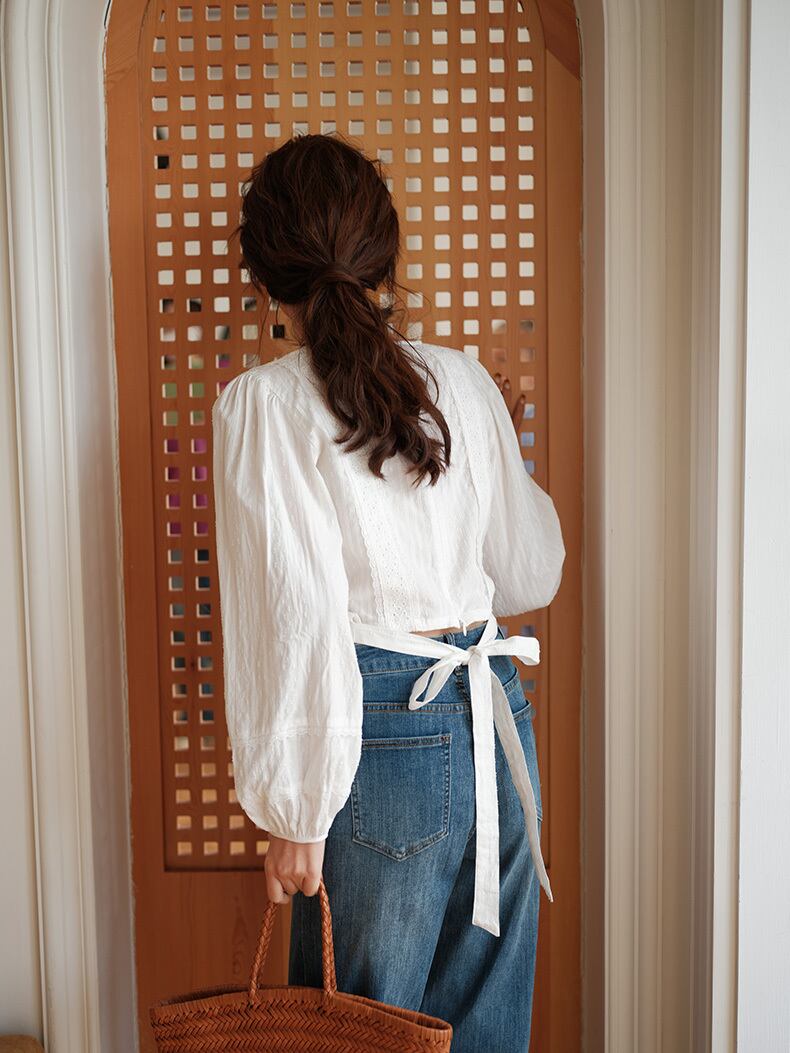 スクエアネックとパフスリーブが女性らしさを引き立て、バックリボンのディテールが可愛らしさをプラスしています。