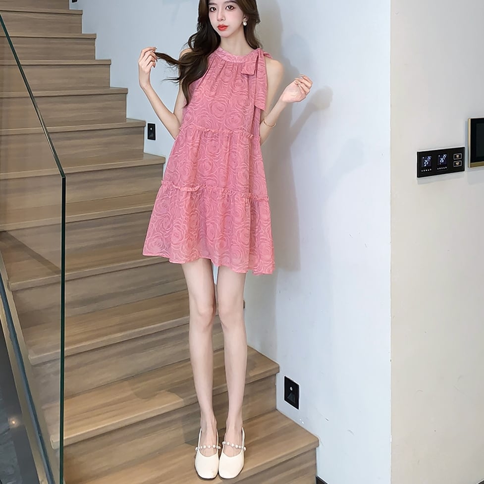 フレアティアードワンピース ミニワンピース レディース ワンピース ドレス ワンピドレス 花柄ワンピース ネックリボン フレアワンピース ティアードワンピース リボン フラワー ボタニカルワンピ 花柄 ショート ノースリーブ 袖なし クルーネック フレア シフォン かわいい 大人可愛い きれいめ シンプル カジュアル 上品 おしゃれ こなれ感 ガーリー クール エレガント デート お出かけ 休日 ショッピング 体型カバー トレンド インスタ映え ゆったり フェミニン