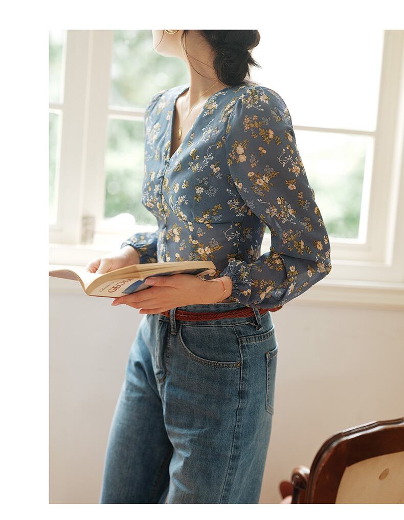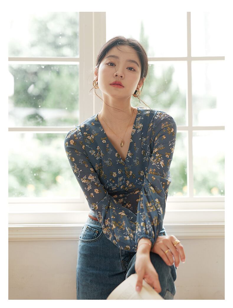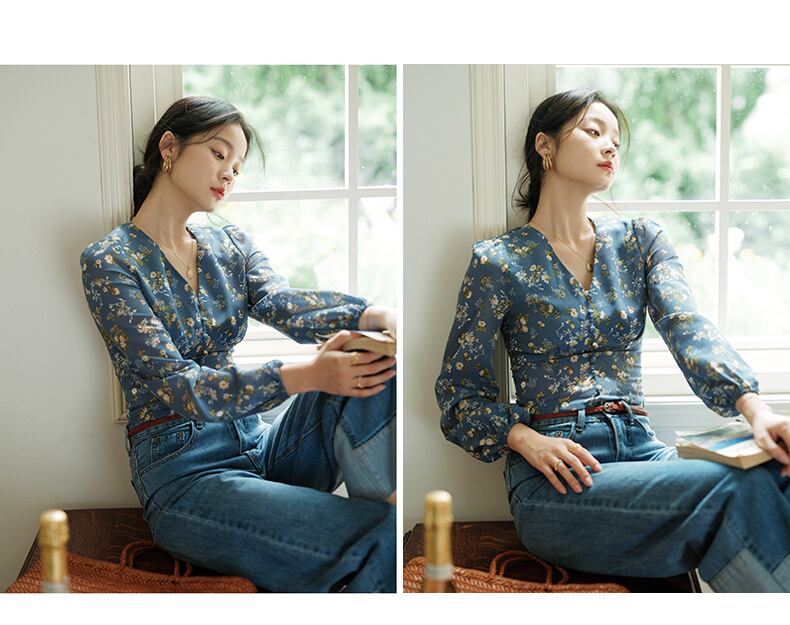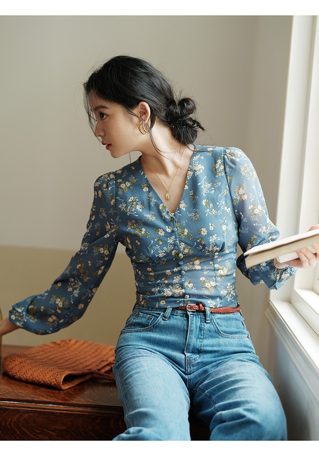 レディース トップス シャツ ブラウス ショート クロップド丈 長袖 Vネック スリム 細身 フェミニン へそ出し 透け感 ボタン ギャザー かわいい 大人可愛い きれいめ シンプル カジュアル 上品 おしゃれ レトロ こなれ感 ガーリー エレガント モダン 存在感 抜け感 ラブリー キュート ベーシック 花柄 フラワー 春 秋 学生 学校 通学 デート お出かけ お泊まり 公園 女子会 休日 高原 ガーデン ショッピング お花見 合コン カフェ 普段使い 着回し モテ 清楚 定番 S M L ブルー