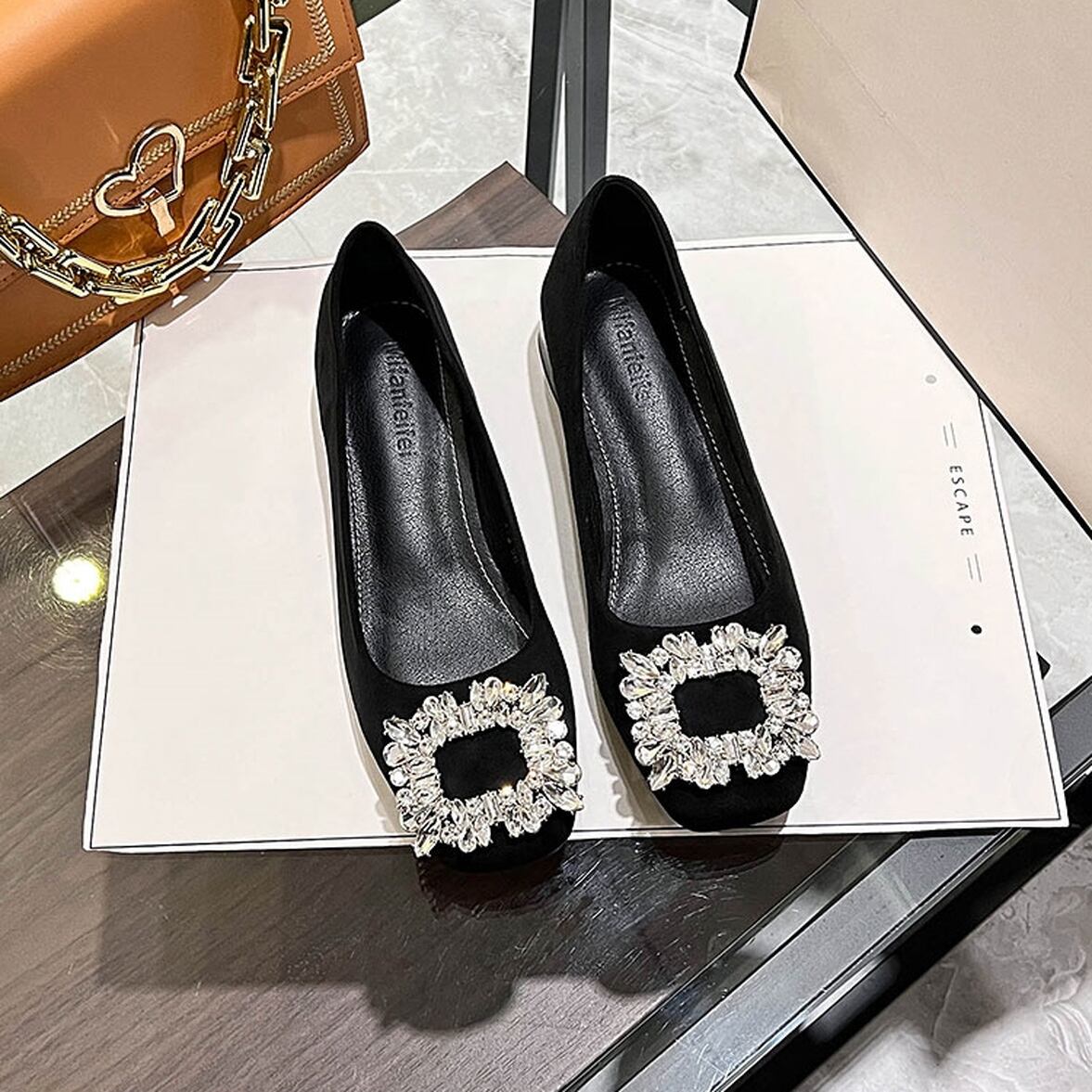 スクエア型のキラキラビジューがアクセントのスエードパンプス。可愛くなりすぎず大人っぽいまま履きこなせる。しなやかなソールで歩きまわる日に頼りになる1足です。気分転換として手にとりやすくコーディネートへのメリットもしっかり