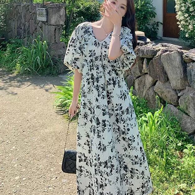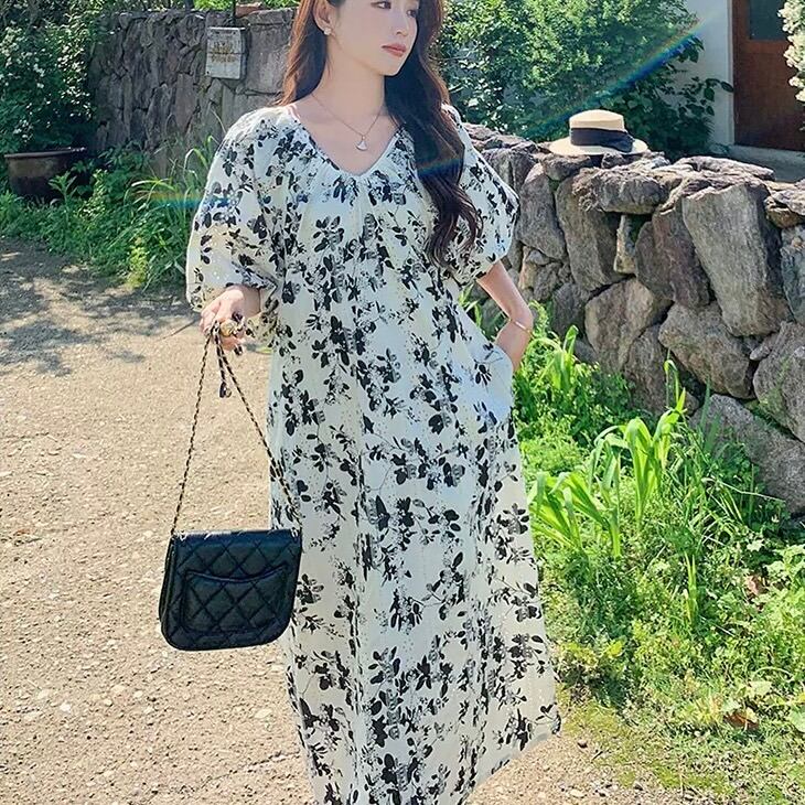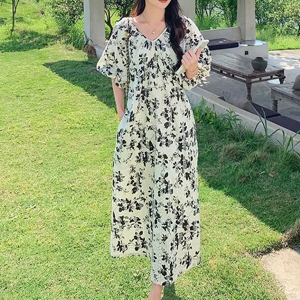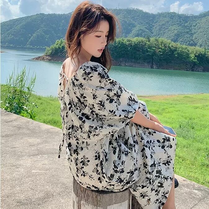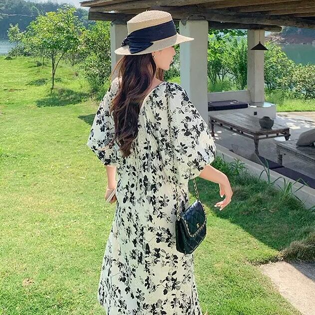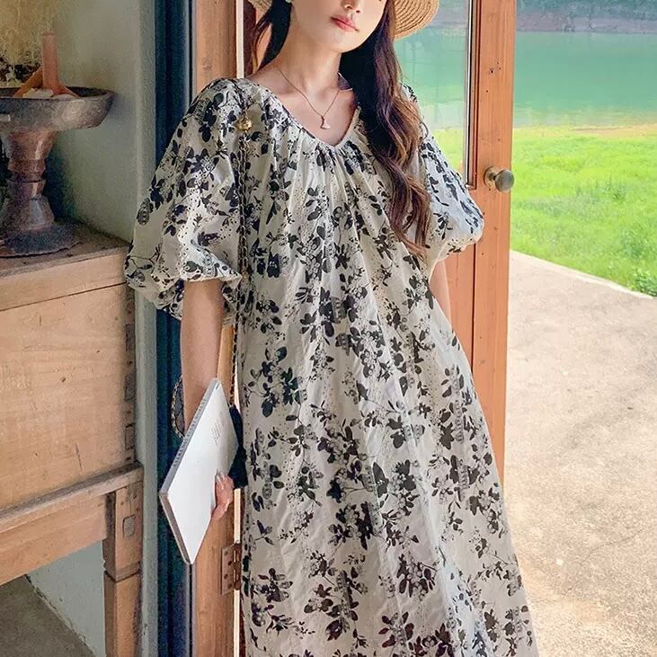 ワンピース 韓国風 バックリボン 肌見せ フレアワンピ ワンピ ロング丈 ロング ミモレ 花柄ワンピース ぽわん袖 バルーン 袖あり 五分丈 Vネック ウエストマーク 大人可愛い きれい シンプル カジュアル 大人 かわいい リゾート ビーチ 上品 おしゃれ お洒落 かっこいい 大人女子 セクシー モダン 春 夏 S M L サイズ展開 春 夏 ロングシーズン デート お出かけ 女子会 華やか 韓国 韓国系 オルチャン ファッション スタイル 海 旅行 ひらひら ゆったり ゆるっと 大人カラー 涼しげ