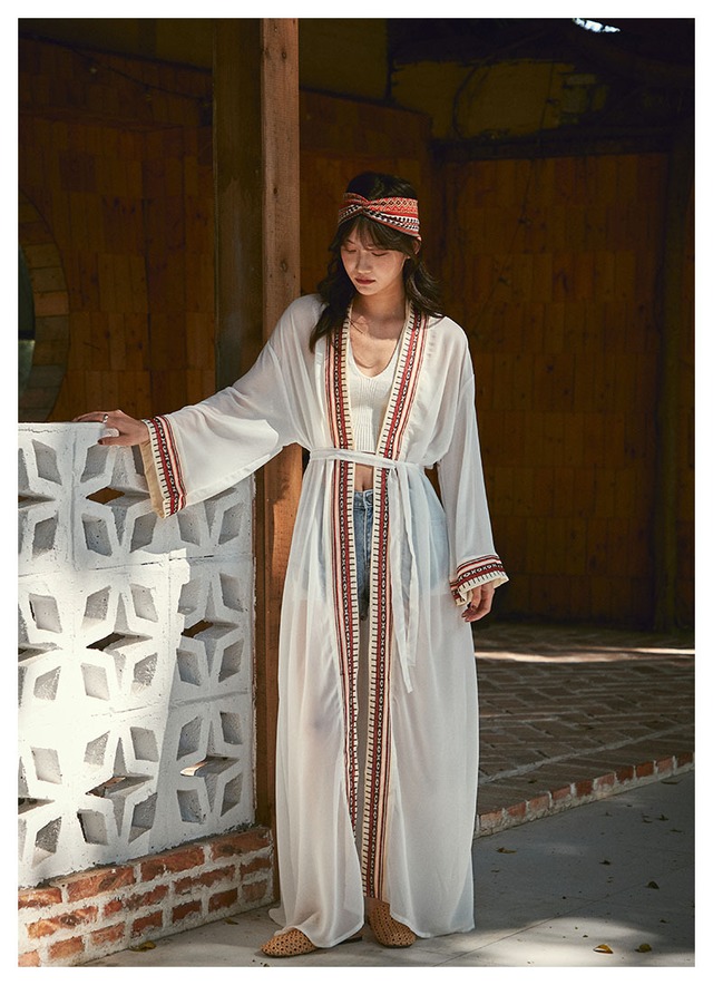 軽やかな透け感のある生地に、エキゾチックな雰囲気が漂う異国風のデザインは、春夏のお出かけやリゾート、ビーチでのスタイルにもぴったりです。