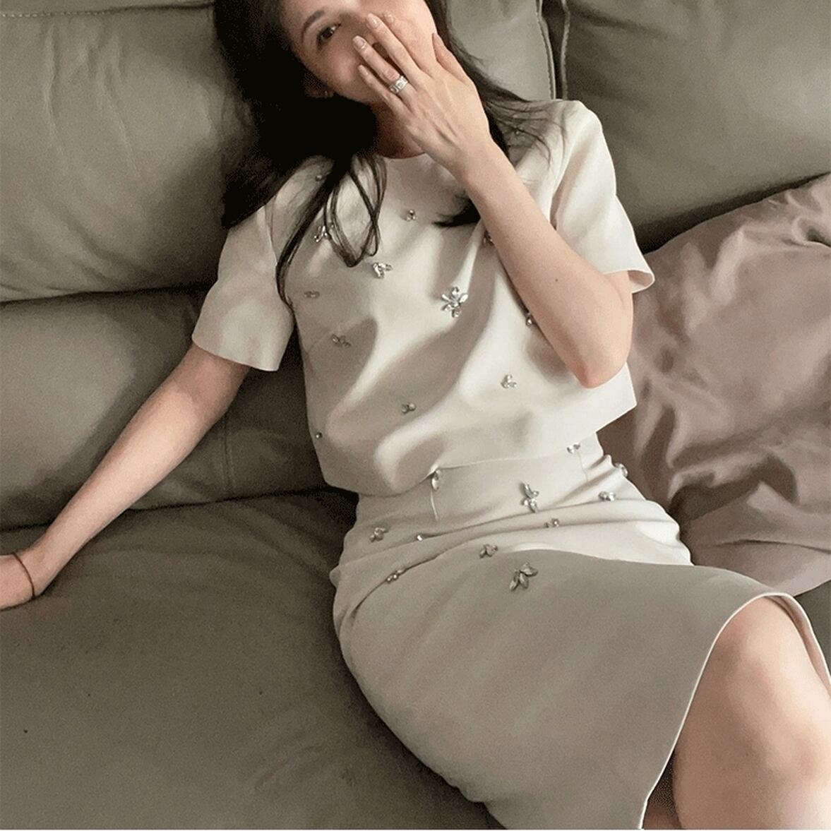 ビジューが大人っぽい好バランスで配置された可愛いスカートセットアップ。切れ味よくクラシックなムードを瞬時に足せる。キレイなデザインとケンカせず着られるバランス。1つ加えるだけで味わいが増す良さを保ったまま主張をしすぎない気の利いたアイテム