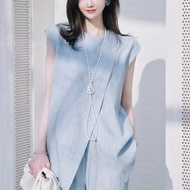 スタイリッシュなノースリーブロングトップスとテーパードパンツのセット。予定やシチュエーションによって変わってくる装い方。そんな移ろうオシャレの気分にも寄り添ってくれる洗練されたクラシック感