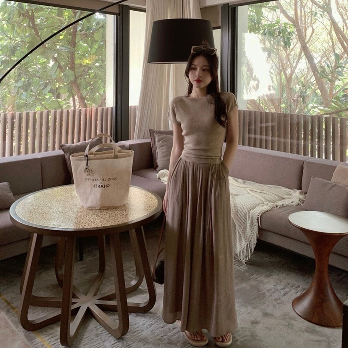 コンパクトなリブカットソーとリラクシーなフレアパンツのセット。予定やシチュエーションによって変わってくる装い方。そんな移ろうオシャレの気分にも寄り添ってくれる洗練されたクラシック感