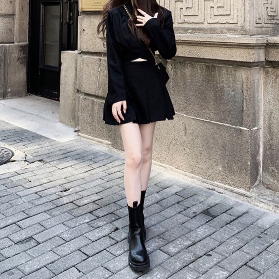 大人キュートなクロップドトップスとミニプリーツスカートのセットアップ。甘い余韻を残しこなれた雰囲気でラクときちんとを両立。1枚で着映えがかなうオシャレに仕上がる使いやすいタイプ