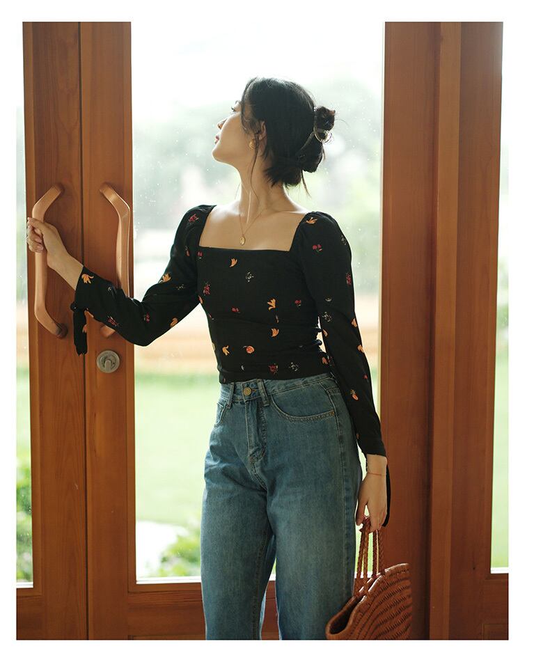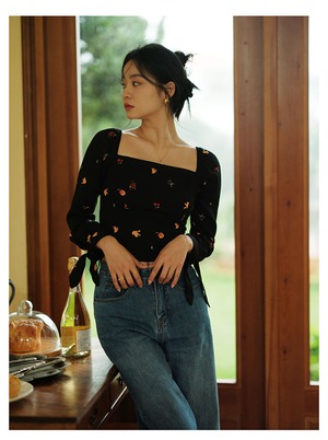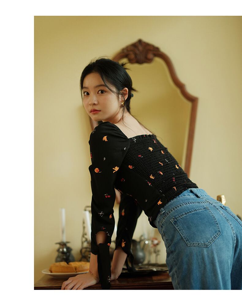 レディース トップス シャツ ブラウス ショート 長袖 スクエアネック 襟なし フルーツ柄 果物柄 スリム 細身 フェミニン リボン かわいい 大人可愛い きれいめ シンプル カジュアル 上品 おしゃれ レトロ こなれ感 ガーリー エレガント モダン 抜け感 ラブリー キュート ベーシック 春 秋 通勤 学生 学校 通学 デート お出かけ お泊まり 公園 女子会 休日 高原 ガーデン ショッピング 合コン コンパ カフェ 普段使い 着回し モテ 清楚 定番 S M L 黒 ブラック