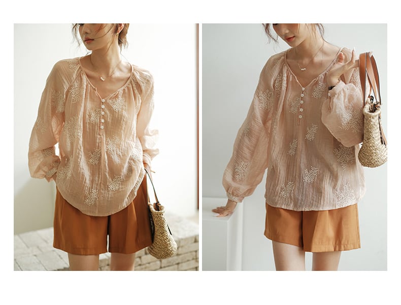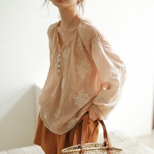 レディース トップス シャツ ブラウス 長袖 パフスリーブ ヘンリーネック 襟なし ノーカラー オーバーサイズ フェミニン 刺繍 ボタン ギャザー 薄手 かわいい 大人可愛い きれいめ シンプル カジュアル 上品 おしゃれ レトロ こなれ感 ガーリー モダン 抜け感 ラブリー キュート ベーシック ナチュラル 春 秋 通勤 学生 学校 通学 デート お出かけ お泊まり 公園 女子会 休日 高原 ガーデン ショッピング お花見 カフェ 普段使い 着回し 清楚 定番 ゆったり フリーサイズ ベージュピンク