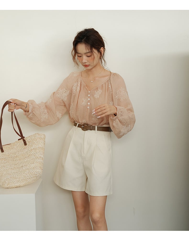 襟なしデザインのヘンリーネックがすっきりとした首元を演出し、ふんわりパフスリーブがフェミニンでありながらも、モダンでこなれ感のあるスタイルを提案します!