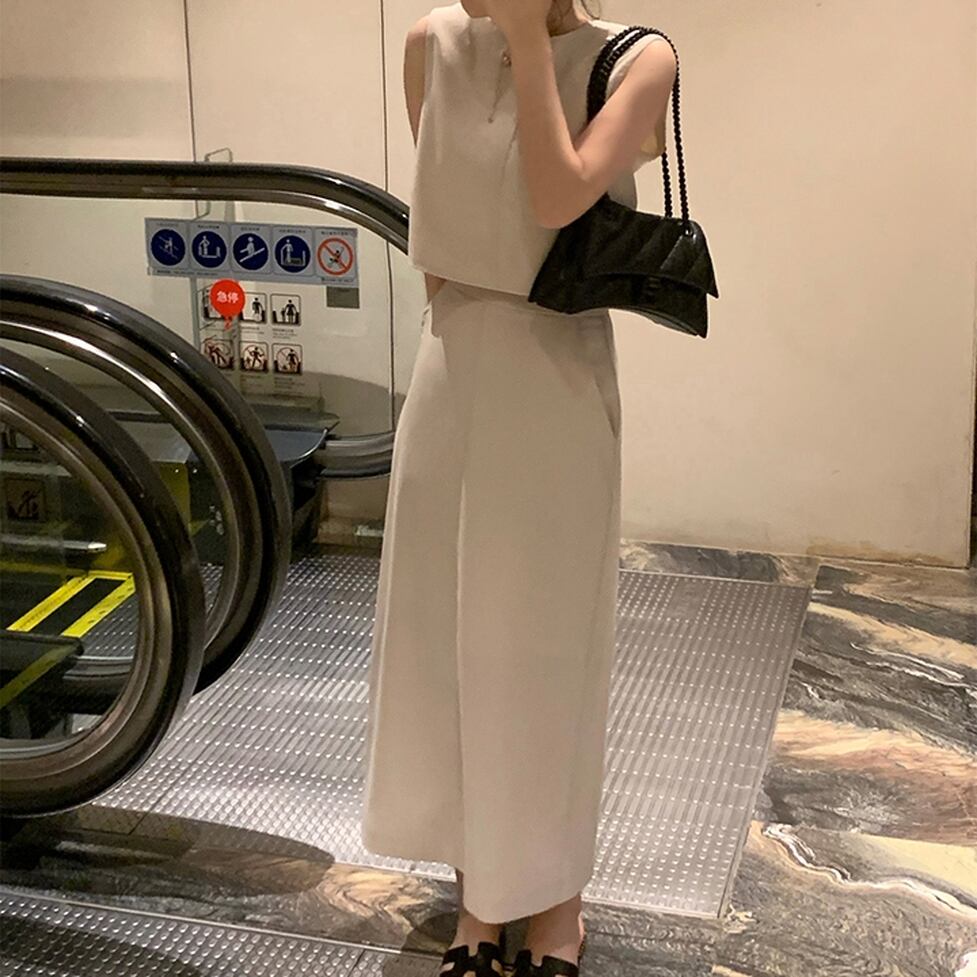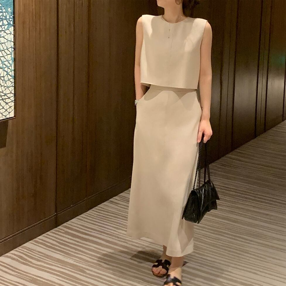 ノースリーブシャツ+ロングスカートセットアップ 袖なしブラウス+ペンシルスカートセットアップ レディース セットアップ ツーピース 2セット ドレス スーツ シャツ ノースリーブ クルーネック ロングスカート ペンシルスカート ストレート スリム ショート丈トップス かわいい 大人可愛い きれいめ シンプル 上品 おしゃれ こなれ感 ガーリー デート お出かけ 休日 ショッピング 楽ちん 体型カバー 普段使い モテ トレンド インスタ映え ゆったり フェミニン
