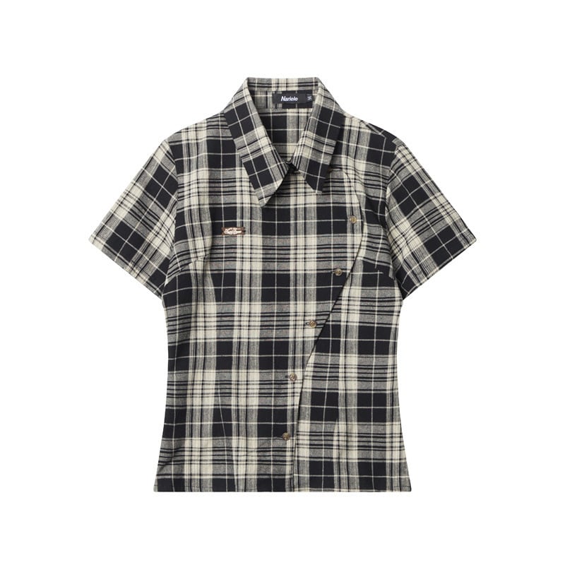 大人可愛いスタイルを実現する、アシメボタンのチェック柄半袖シャツ!襟付きの角襟デザインが華やかさをプラスし、スリムなシルエットでスタイリッシュに見せてくれます。前開き仕様により、重ね着や着こなしの幅も広がり、さまざまなシーンで活躍します。カジュアルなデイリースタイルから、学校や通勤、デート、お出かけまで、幅広くご利用いただける一着です。