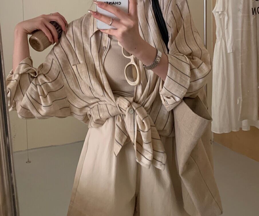 ストライプ柄 長袖 ルーズ シャツ レディース トップス 羽織 丈長 ミディアム 長袖 ドロップショルダー 襟付き 角襟 ポロカラー ポケット 前開き ボタン かわいい 大人可愛い シンプル カジュアル おしゃれ レトロ こなれ感 ルーズ 存在感 ストライプ 春 夏 秋 ママ 通勤 学生 学校 通学 デート お出かけ 旅行 公園 女子会 休日 ショッピング カフェ 重ね着 体型カバー 普段使い 着回し レイヤード 紫外線対策 UV対策 ゆったり フリーサイズ カーキ