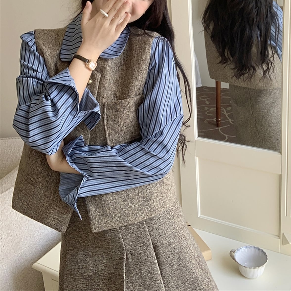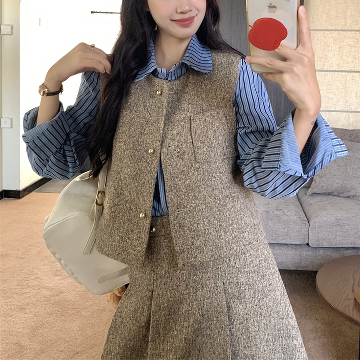 スカートセットアップ ベスト+シャツ+スカートセットアップ ミニスカート ロングスカート レディース セットアップ スリーピース 3点セット スーツ 襟付きシャツ ストライプシャツ プリーツスカート かわいい 大人可愛い きれいめ シンプル カジュアル 上品 おしゃれ かっこいい こなれ感 マニッシュ ガーリー キュート 通勤 通学 デート お出かけ 休日 ショッピング 楽ちん 体型カバー 普段使い モテ トレンド インスタ映え ゆったり フェミニン