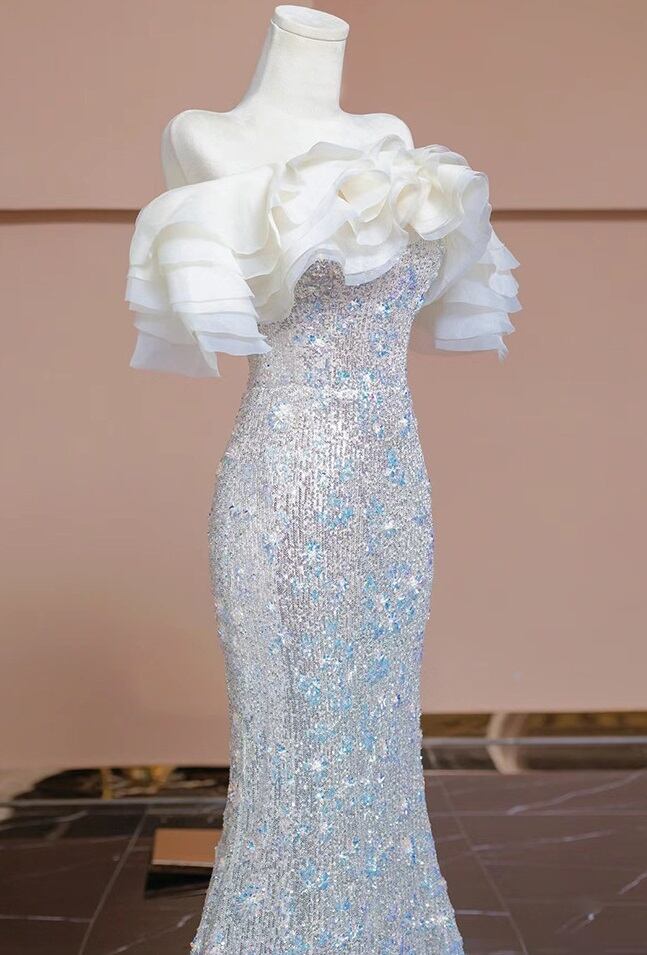 スパンコール フリル マーメイドドレス ドレス ワンピース パーティー 演奏会 発表会 ステージ 舞台 衣装 ロング マキシ 袖なし ノースリーブ オフショル 襟なし チューブトップ マーメイド スリム 細身 フリル 切り替えデザイン バック レースアップ 可愛い きれいめ 大人可愛い 上品 おしゃれ エレガント 主役級 存在感 ゴージャス エレガント 華やか イベント 二の腕カバー 高見え 格上げ 春 夏 秋 演奏会 XS 2XL 3XL 小さい 大きい S M L XL スリム シルバー
