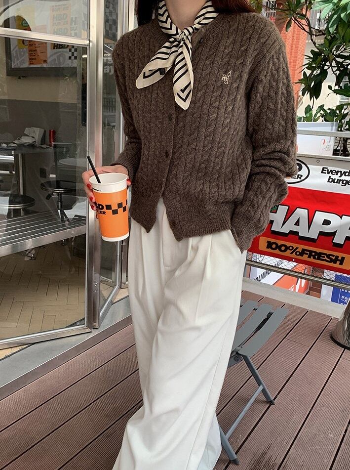 ラウンドネック ケーブル編みニットカーディガン レディース トップス ニット カーディガン 上着 羽織 ミディアム 長袖 襟なし 刺繍 前開き ケーブルニット 編み込み 編み上げ ボタン かわいい 大人可愛い きれいめ シンプル カジュアル おしゃれ こなれ感 ロゴ 春 秋 冬 ママ 通勤 学生 学校 通学 デート お出かけ 旅行 公園 女子会 休日 ショッピング カフェ 重ね着 暖かい 普段使い 着回し レイヤード ゆったり フリーサイズ ブルー コーヒーブラウン