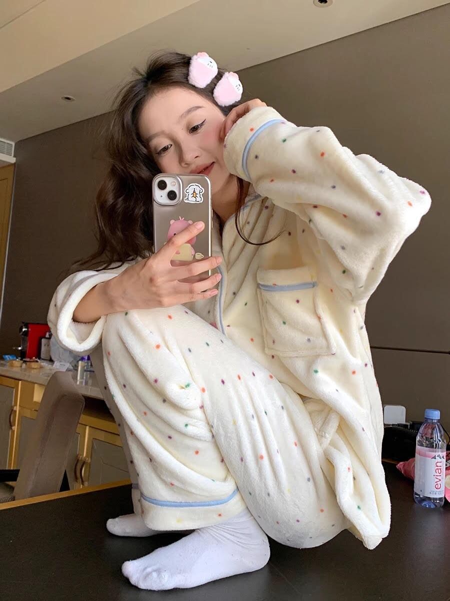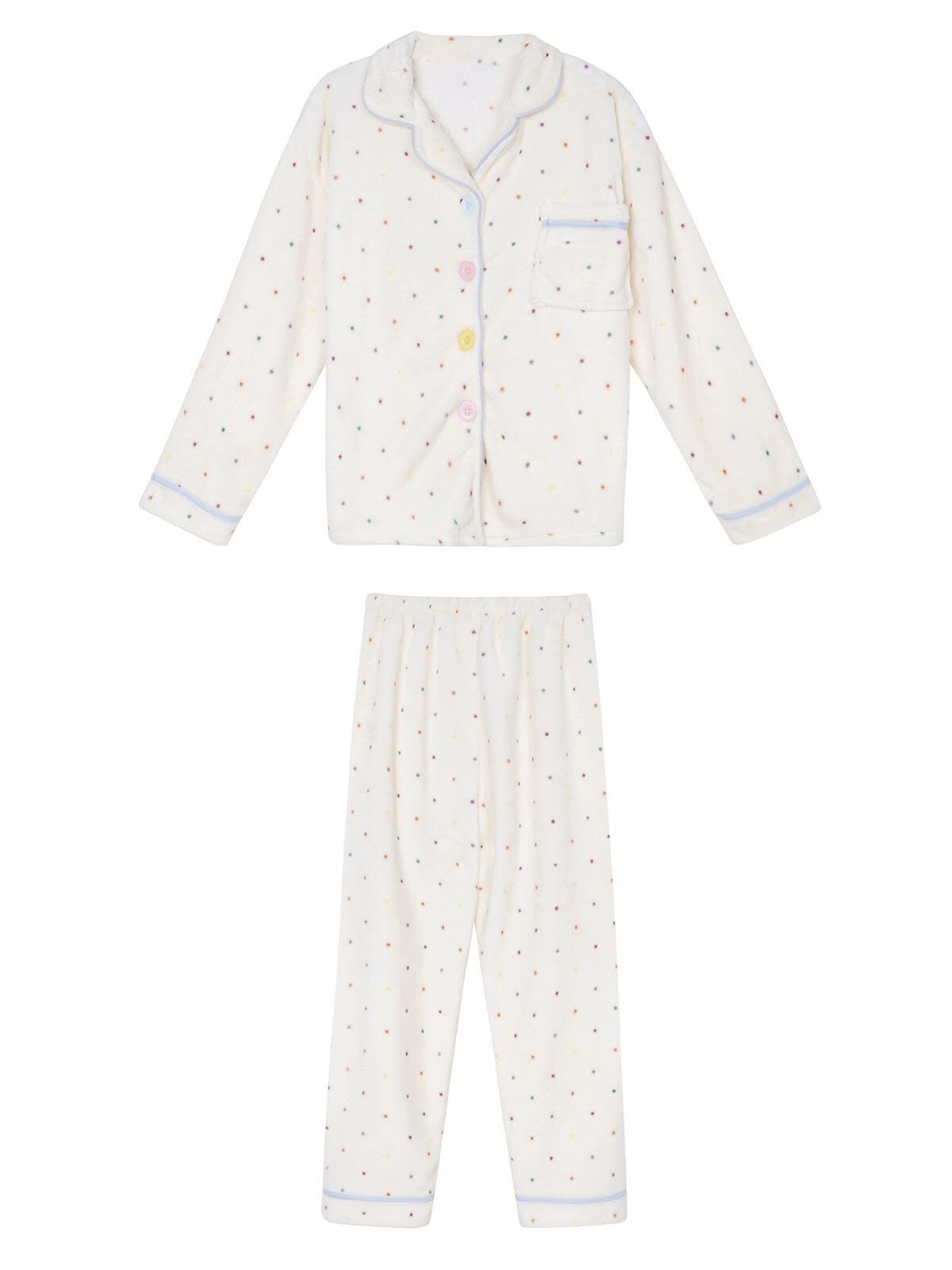 セットアップ レディース トップス パンツ ルームウェア パジャマ ストレートパンツ 長袖 ラウンドネック 襟付き ふわふわ ポケット ハイウエスト 前開き 伸縮性 ベルベット ストレッチ かわいい 大人可愛い きれいめ シンプル カジュアル おしゃれ ラフ ガーリー ルーズ とろみ感 抜け感 ラブリー キュート 学生風 ナチュラル ドット柄 水玉 冬 お泊まり アウトドア キャンプ 旅行 休日 重ね着 双子 韓国 オルチャン コーデ 楽ちん 暖かい 防寒 体型カバー 普段使い S M L ライトベージュ