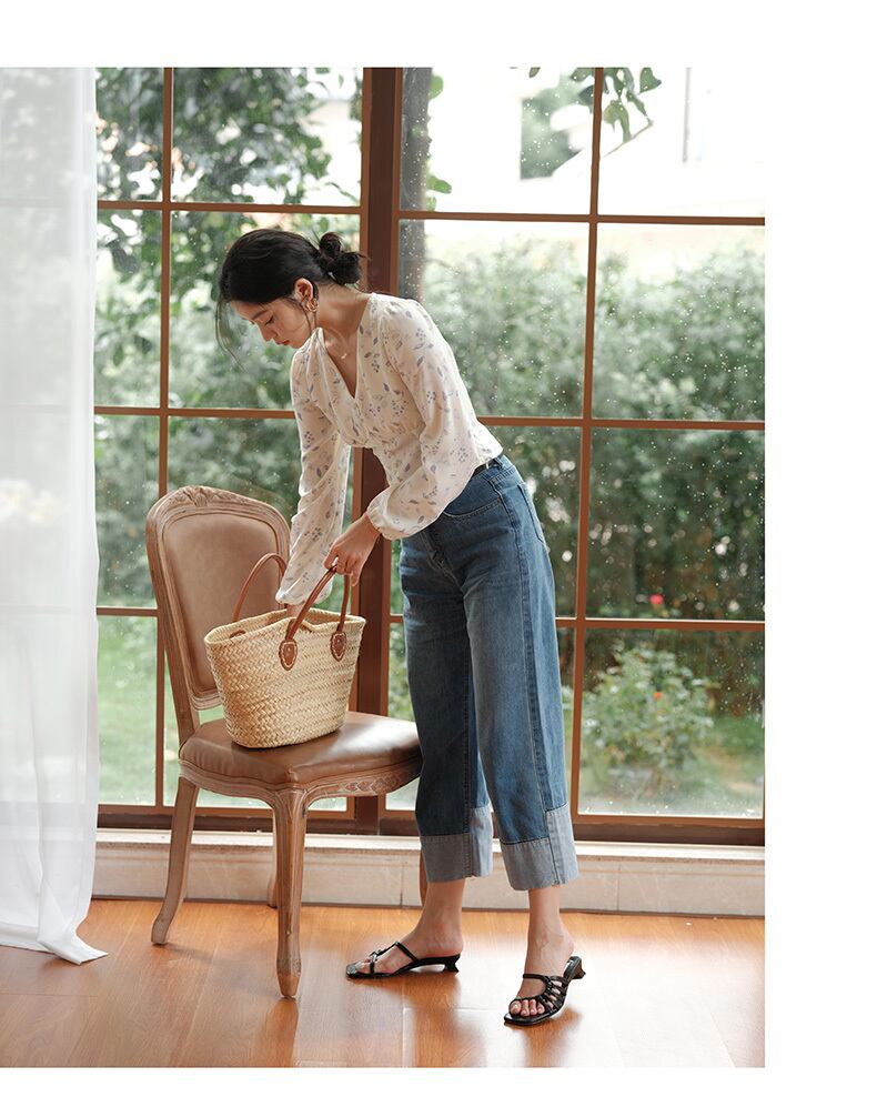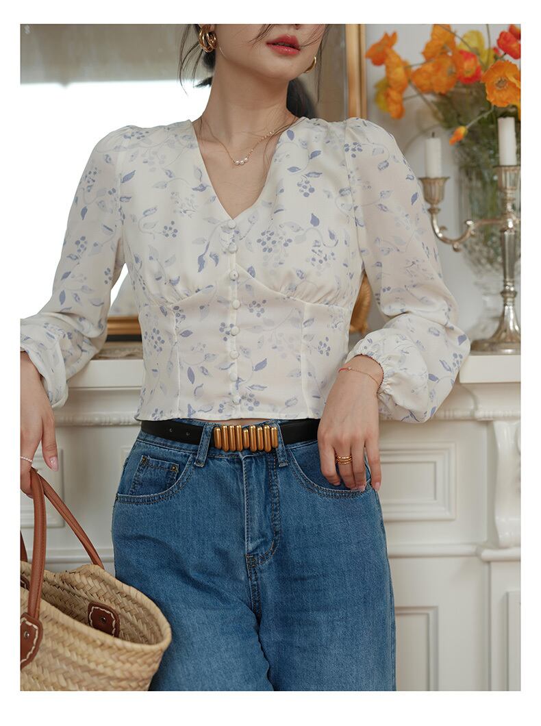 ふんわりパフスリーブにVネックデザインが女性らしさを引き立てます。