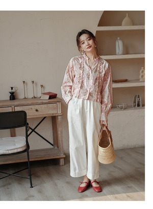花柄デザインにスタンドカラーが上品な印象を与えつつ、かわいらしさも兼ね備えています。