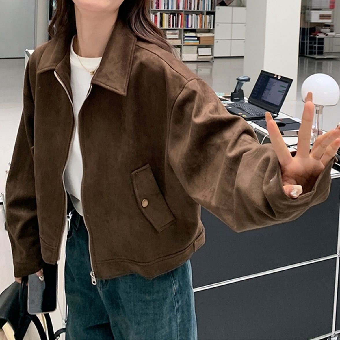少しハードな要素をプラスしたガーリーでかっこいいブルゾンジャケット。シルエットを生かすように着るだけでさまになる大人っぽい余裕がにじむ。映える見た目に着地してそのうえ主張もしすぎないハイコスパなアイテム