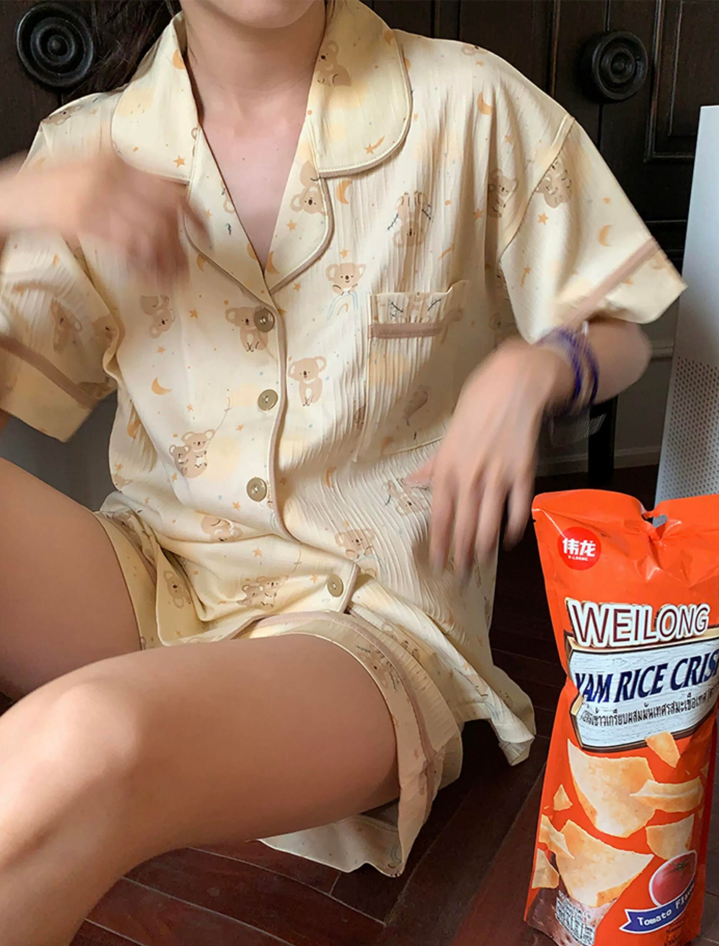 セットアップ レディース ルームウェア パジャマ 部屋着 クマ柄 寝巻き ショートパンツ 半袖 Vネック 襟付き オーバーサイズ ポケット 前開き 伸縮性 かわいい 大人可愛い 大人女子 きれいめ シンプル カジュアル おしゃれ お洒落 ラフ ガーリー ルーズ とろみ感 抜け感 ラブリー キュート ガーリー 存在感 学生風 ナチュラル 夏 お泊まり アウトドア キャンプ 旅行 休日 双子 韓国 オルチャン コーデ トレンド 流行 楽ちん 体型カバー 普段使い デイリー M L XL 2XL ライトベージュ