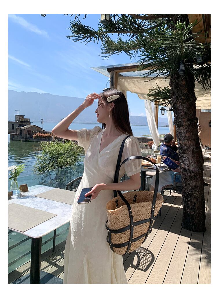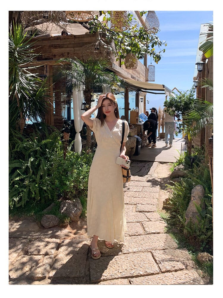 レディース ワンピース ロング 半袖 パフスリーブ Vネック カシュクール フレア Aライン フェミニン リボン ギャザー かわいい 大人可愛い きれいめ シンプル カジュアル 上品 おしゃれ こなれ感 ガーリー エレガント 抜け感 ラブリー キュート ベーシック ナチュラル 総柄 春 夏 学生 学校 通学 デート お出かけ お泊まり リゾート 旅行 公園 女子会 休日 バカンス 高原 ガーデン ショッピング カフェ 普段使い 着回し モテ 清楚 定番 S M L ゆったり ベージュ