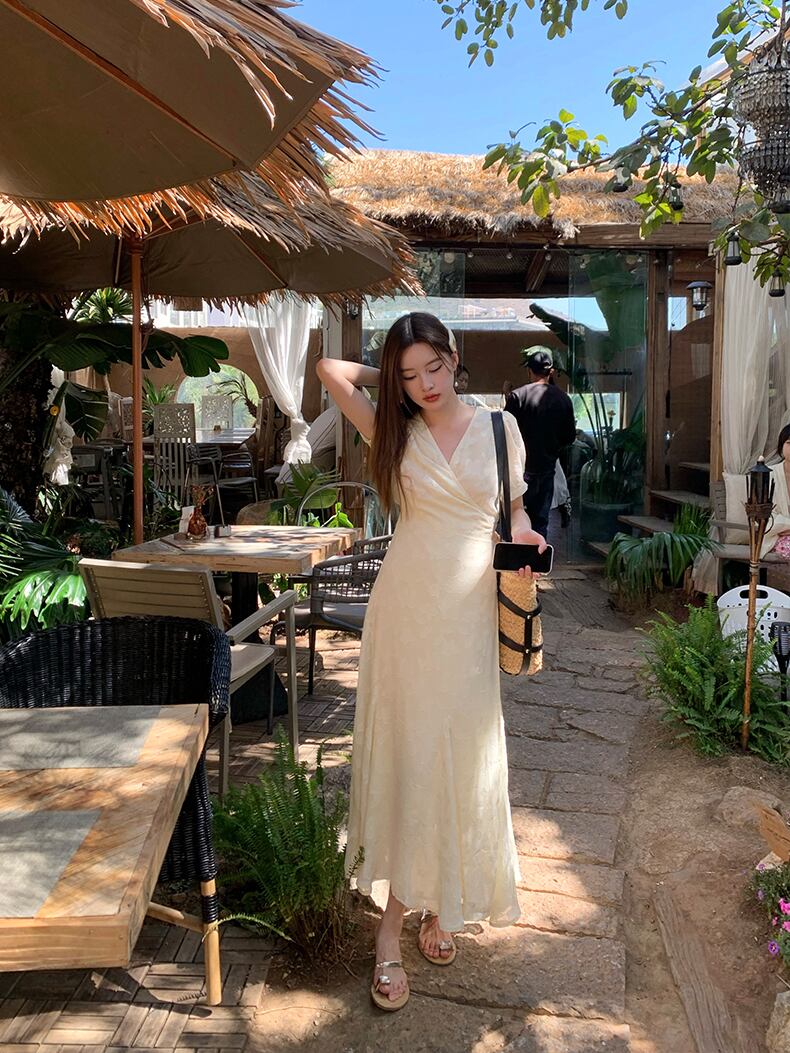 パフスリーブとVネックが大人の女性の魅力を引き立て、カシュクールスタイルが、抜け感と上品さを演出。
