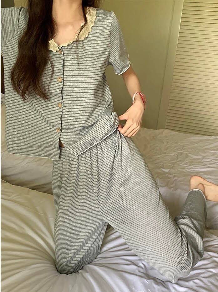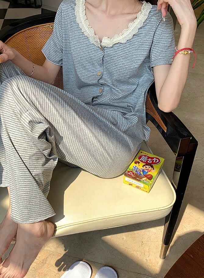 セットアップ レディース ルームウェア パジャマ 部屋着 寝巻き 半袖 ラウンドネック レース オーバーサイズ かわいい 大人可愛い 可愛い 大人女子 大人 きれいめ シンプル カジュアル おしゃれ お洒落 ラフ ガーリー ルーズ とろみ感 抜け感 ラブリー キュート 存在感 主客級 学生風 ナチュラル ボーダー柄 夏 お泊まり アウトドア キャンプ 旅行 休日 双子 韓国 オルチャン コーデ トレンド 流行 楽ちん 普段使い デイリー M L XL 2XL ルーズ ゆったり 灰色 グレー