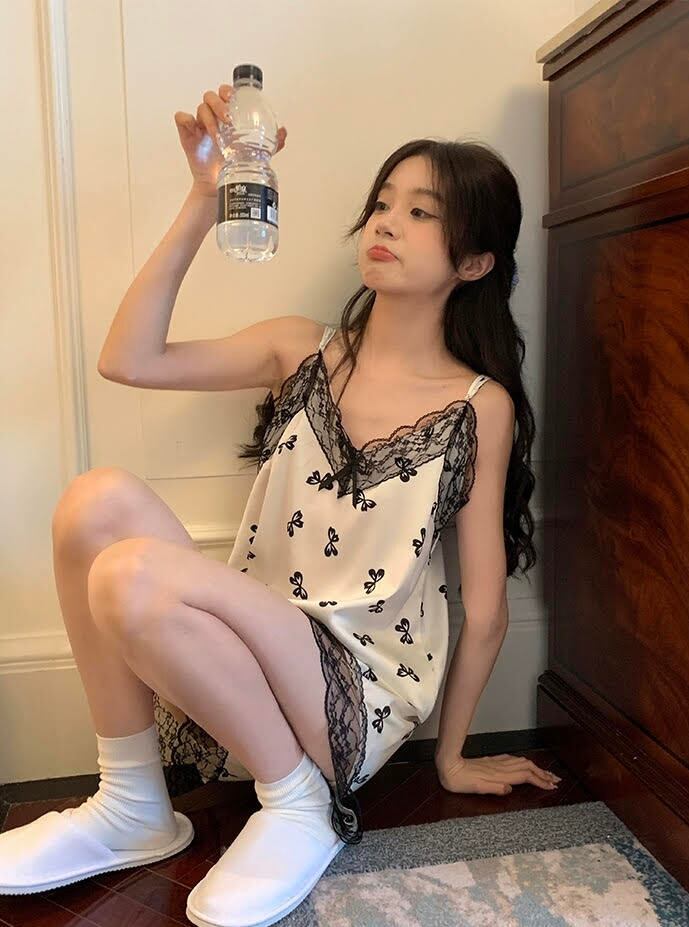 細身のシルエットに、エレガントなレースと可愛いリボンのディテールが加わり、大人可愛い魅力を引き立てます。