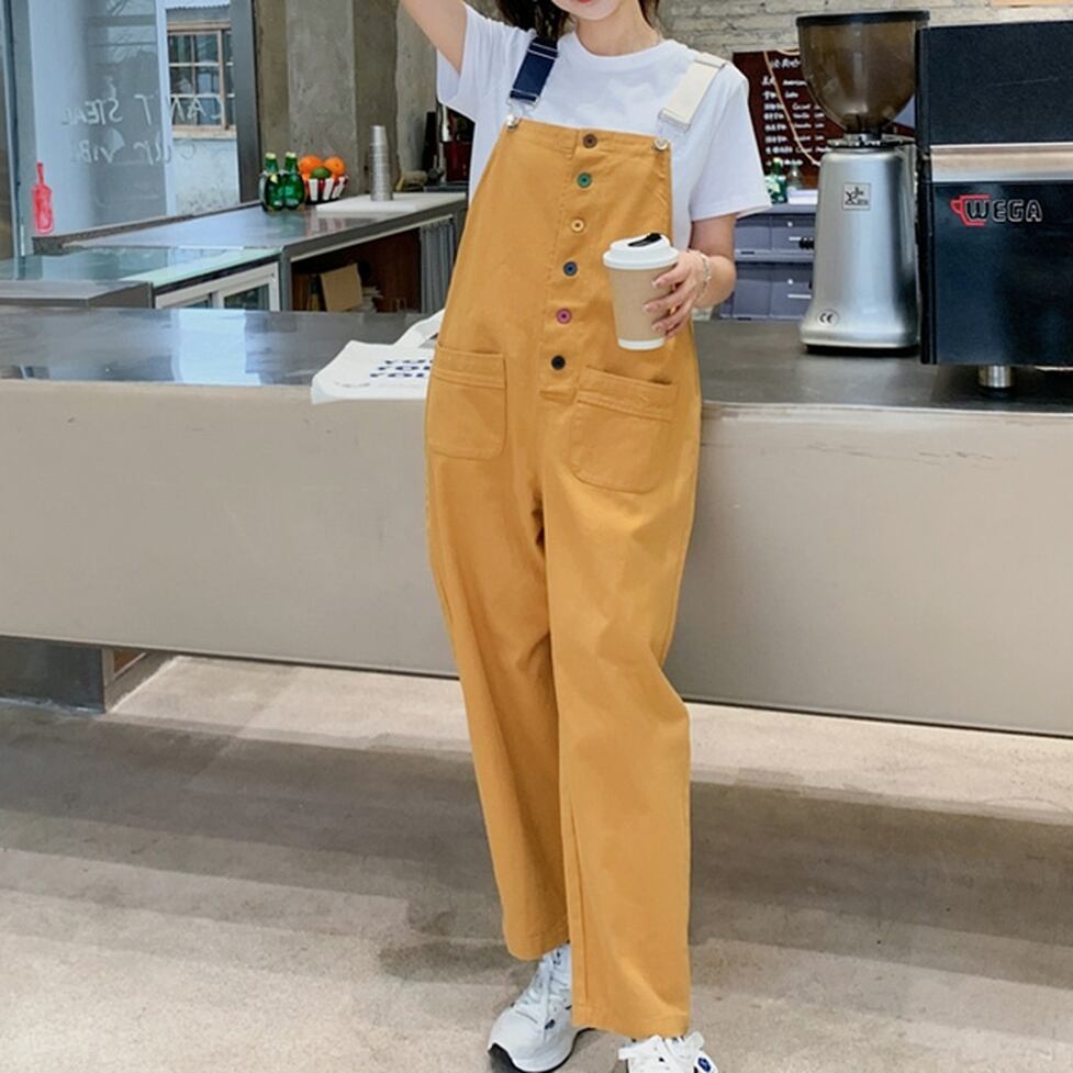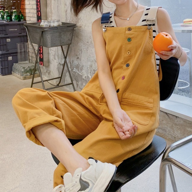 カラフルなフロントボタンにストラップのバイカラーがポイントのオーバーオール。こなれた表情に親しみやすさがそなわるシンプルで着回せるのに目を引くデザイン。カジュアルでもモードでもないほどよいバランスにで少量の抜けを確保