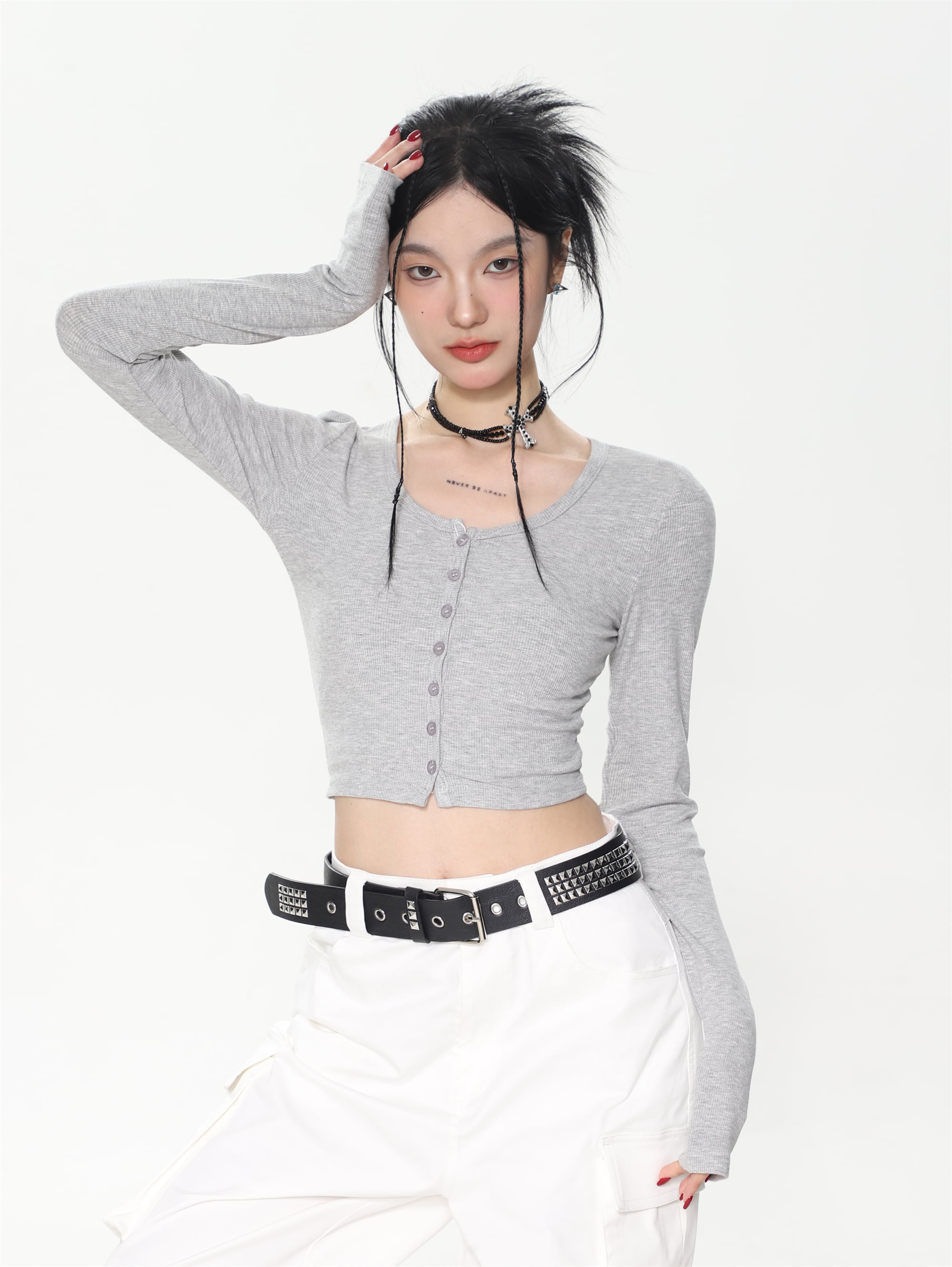 ハイウエストのボトムと組み合わせて、へそ出しスタイルも楽しめます。