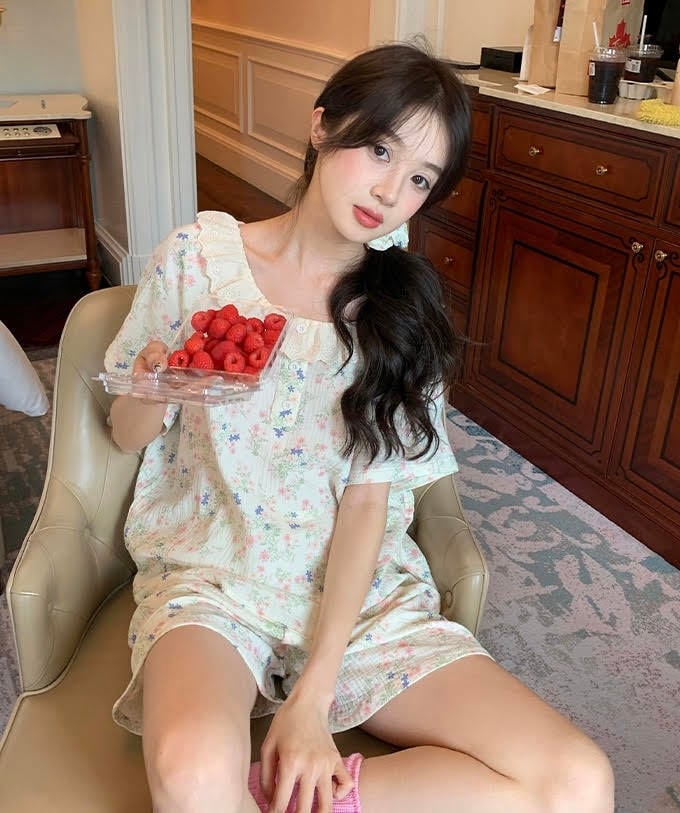 半袖のラウンドネックとフリルのデザインが柔らかい印象を与え、ショートパンツの組み合わせが快適な着心地を実現します。