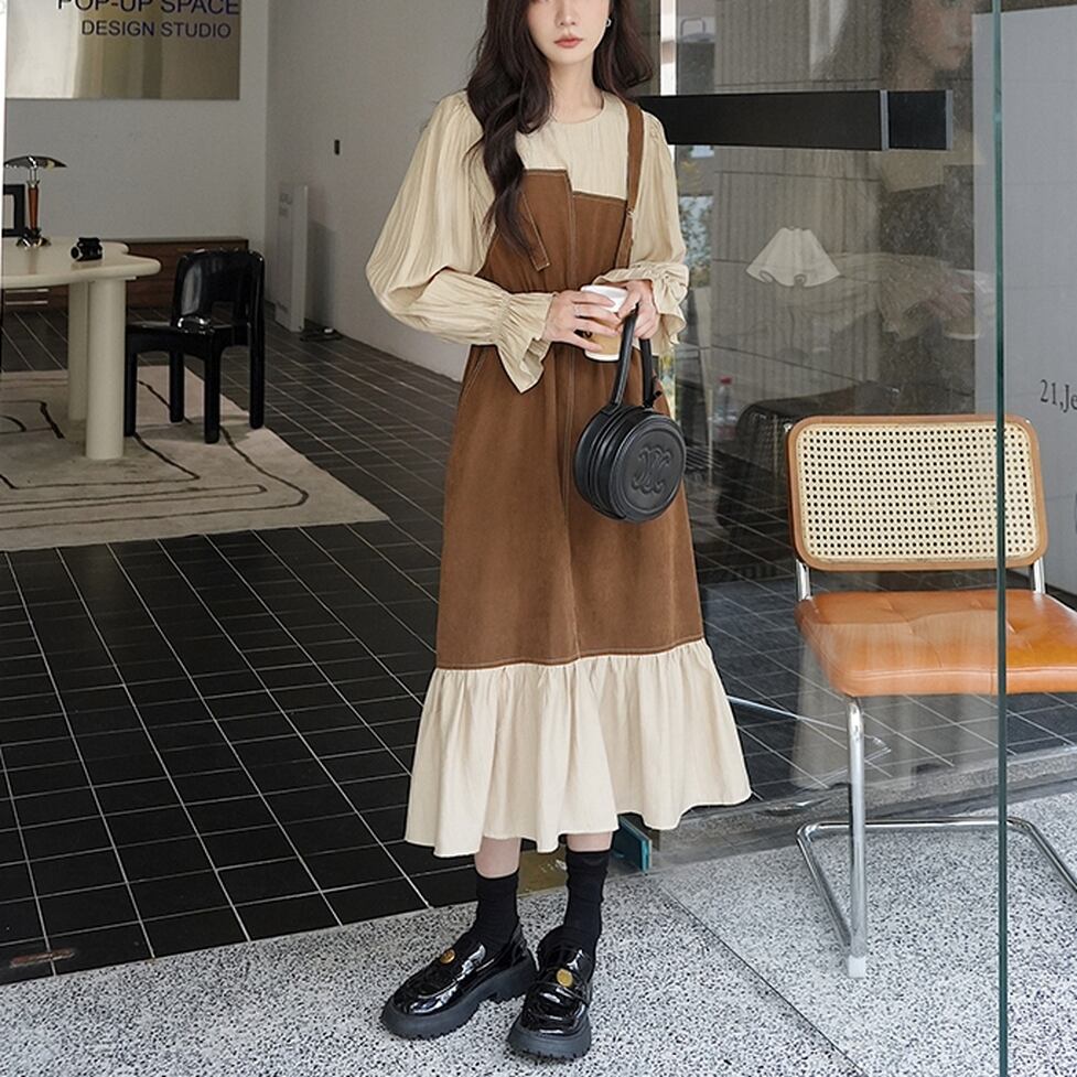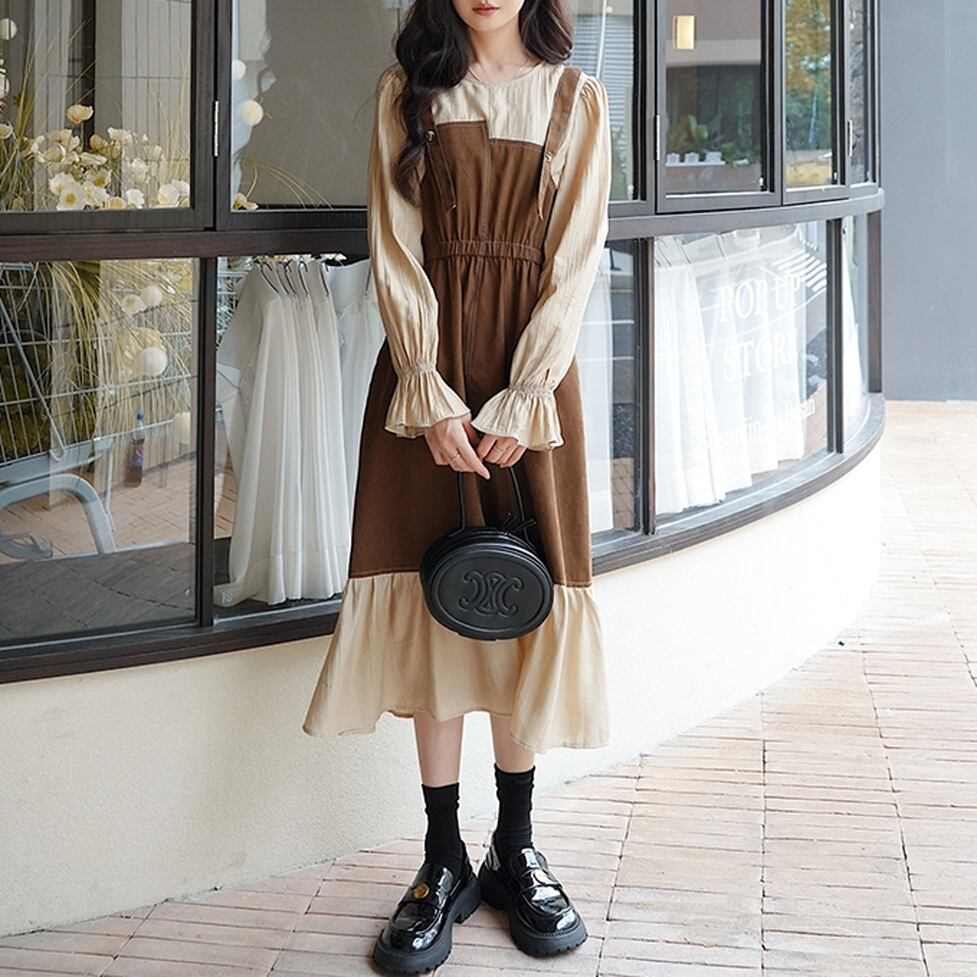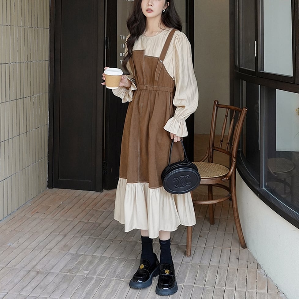 ジャンパースカートをモチーフにしたデザインをドッキングした大人ガーリーなロングワンピース。ぱっと見て可愛いわかりやすさを彩るオシャレを大切に。気分に沿ったキレイさと味わい深さという日常に寄り添うアイテム