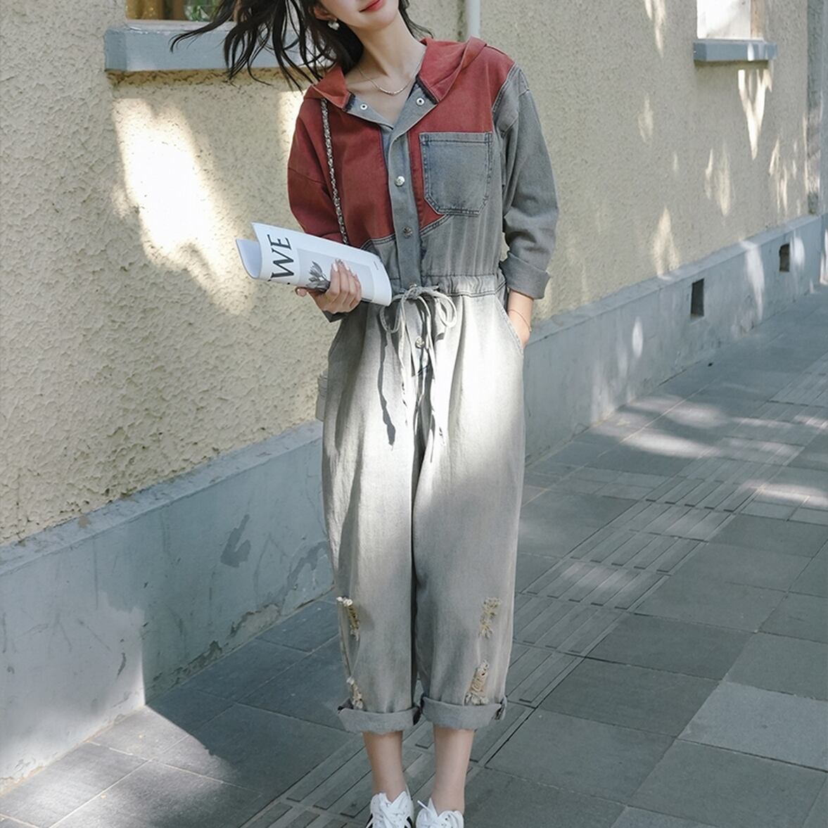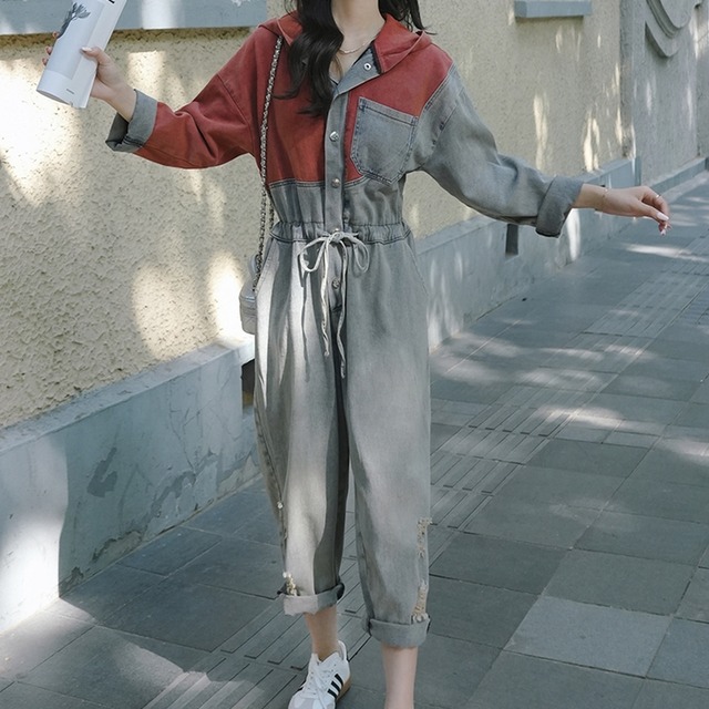 デニムオールインワンパンツ ダメージデニムドッキングオールインワン レディース オールインワン ジャンプスーツ デニムオールインワン オールインワンパンツ つなぎ ダメージデニム フード付き パーカー デニム ドッキング 切り替え フロントボタン ダメージ かわいい 大人可愛い カジュアル おしゃれ かっこいい こなれ感 マニッシュ ガーリー キュート デート お出かけ 休日 ショッピング 楽ちん 体型カバー 普段使い トレンド インスタ映え ゆったり フェミニン