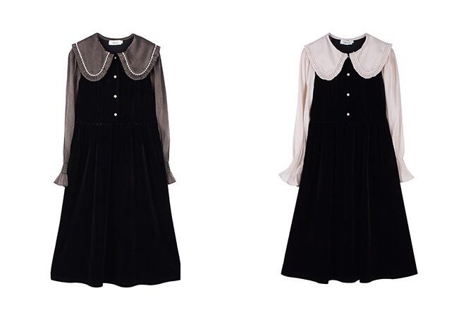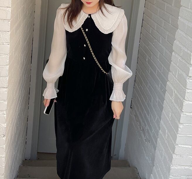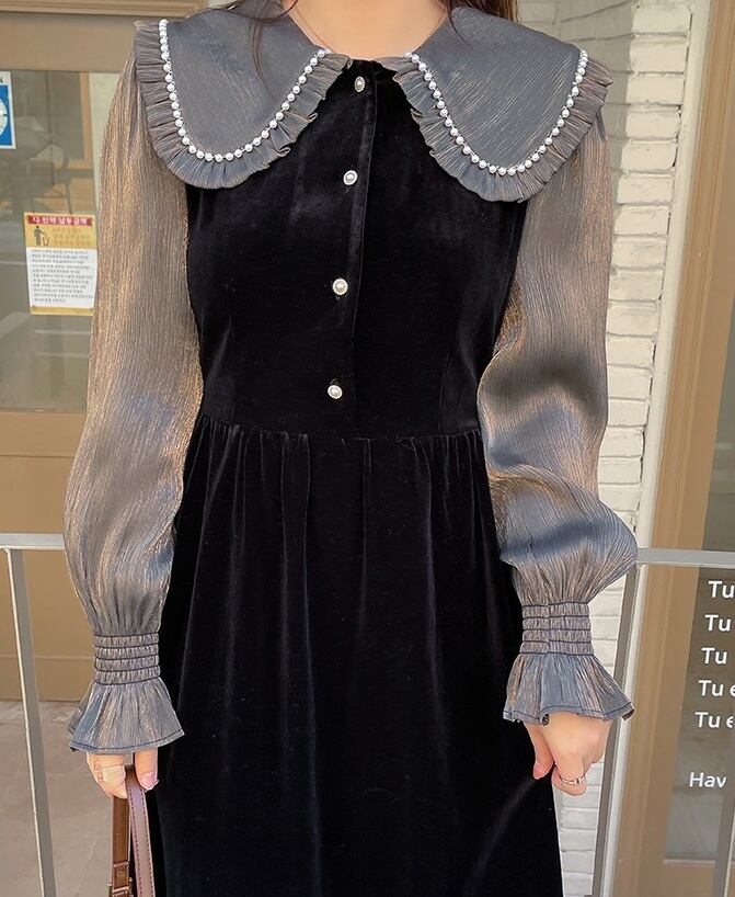 大人可愛いを演出する大きいサイズのベロアミモレ丈ワンピース!大きめの襟とフレアスリーブが特徴で、優雅なシルエットを引き立てます。ラウンドネックとパール付きのドールカラーが華やかさをプラスし、特別な日のお出かけやデート、二次会にもぴったりの一着です。膝下のミモレ丈が上品で、スタイリッシュな印象を与えてくれます。