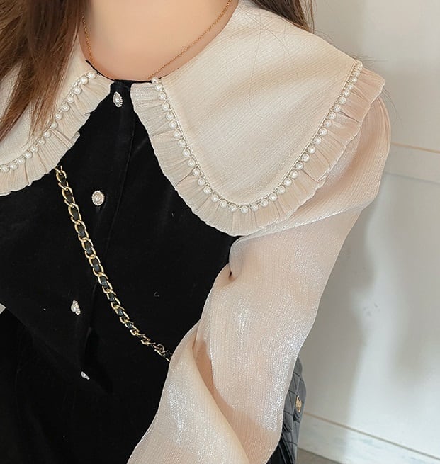 大きいサイズ 大きめ襟 ベロア ミモレ丈ワンピース レディース ワンピース ドレス 膝下 ミモレ ロング 長袖 フレアスリーブ ラウンドネック 襟付き 丸襟 パール付き ドールカラー フレア 切り替え フェミニン フリル ハイウエスト ボタン パール ベルベット かわいい 大人可愛い きれいめ 上品 おしゃれ ガーリー エレガント 無地 春 秋 冬 二次会 発表会 ママ 通勤 学生 学校 通学 デート お出かけ 旅行 女子会 休日 カフェ 普段使い 着回し XL 2XL ゴールド 光沢 アプリコット