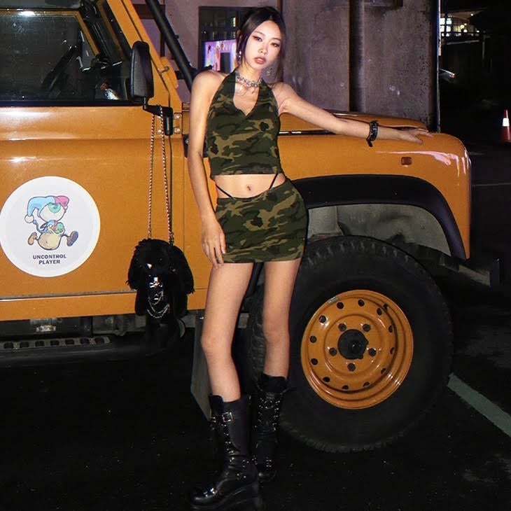 タイトなシルエットが美脚を引き立て、さらにへそ出しデザインがセクシーさをプラスします。
