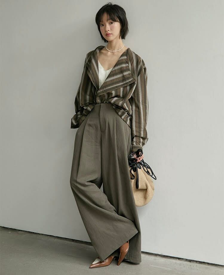 ストライプ柄がさりげないアクセントになり、カジュアルからきれいめまで幅広いスタイリングに対応できるアイテムです。