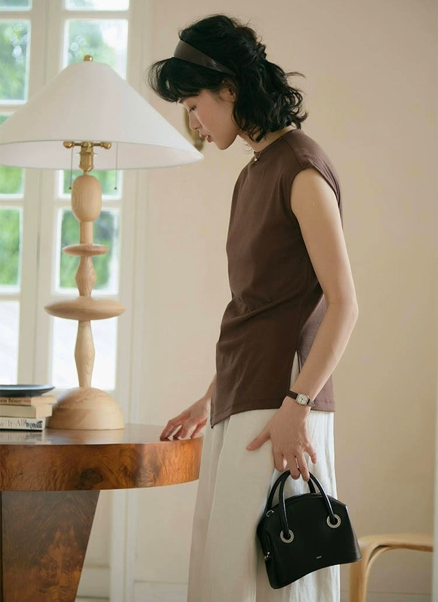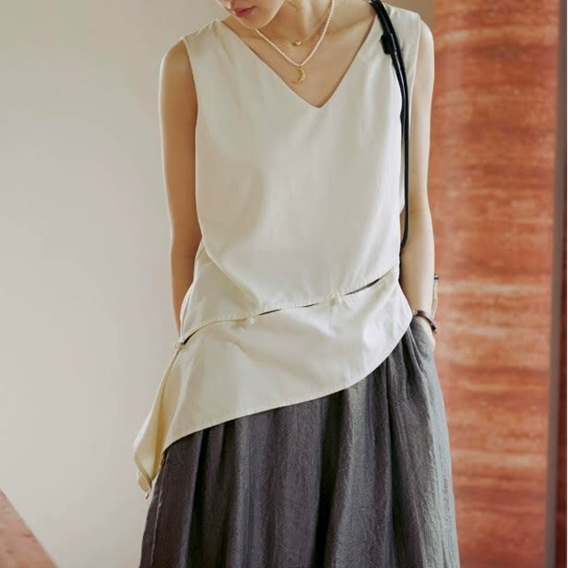 ハイネックデザインが上品さを引き立て、スリムで細身のシルエットのノースリーブシャツです。