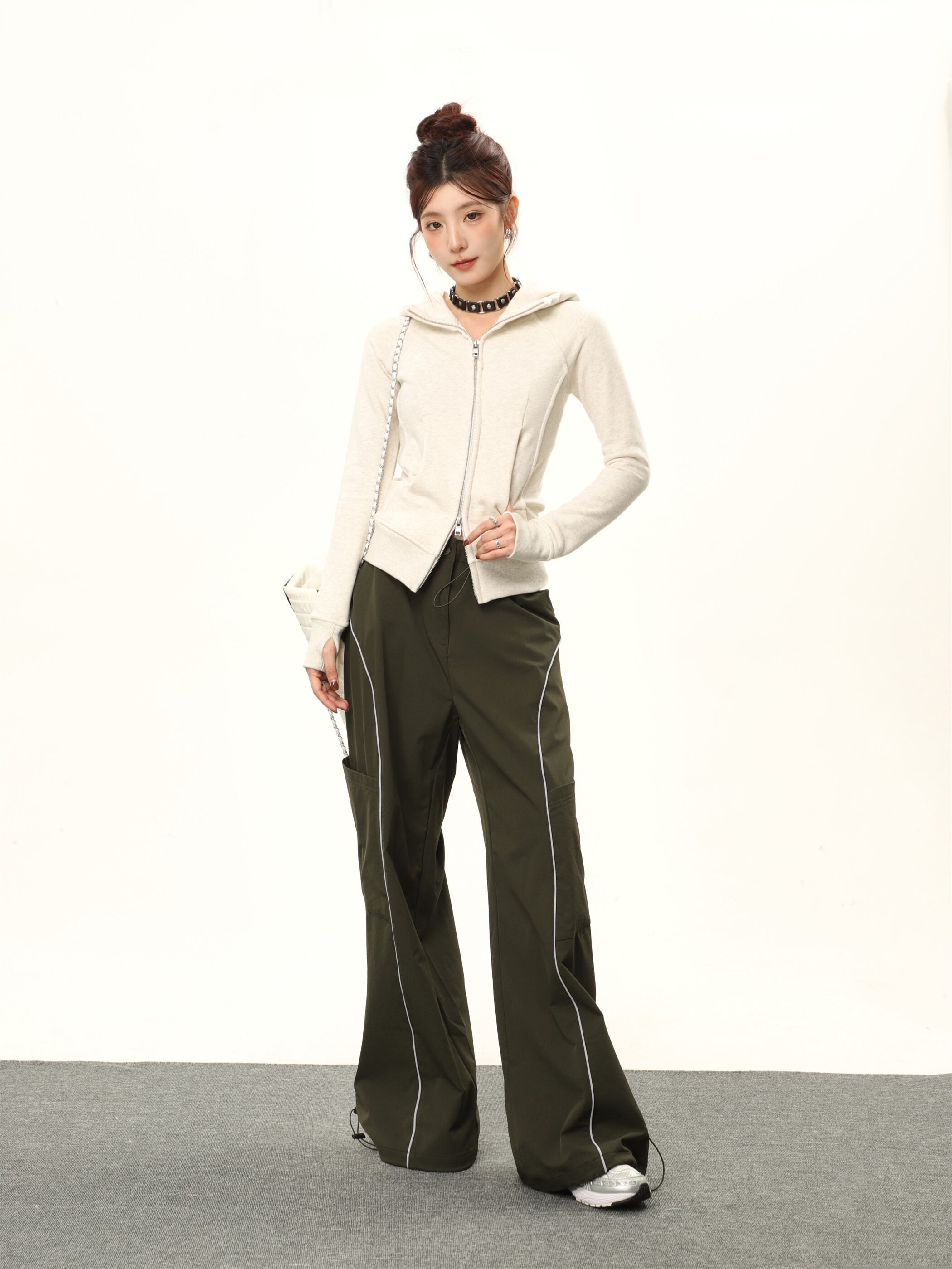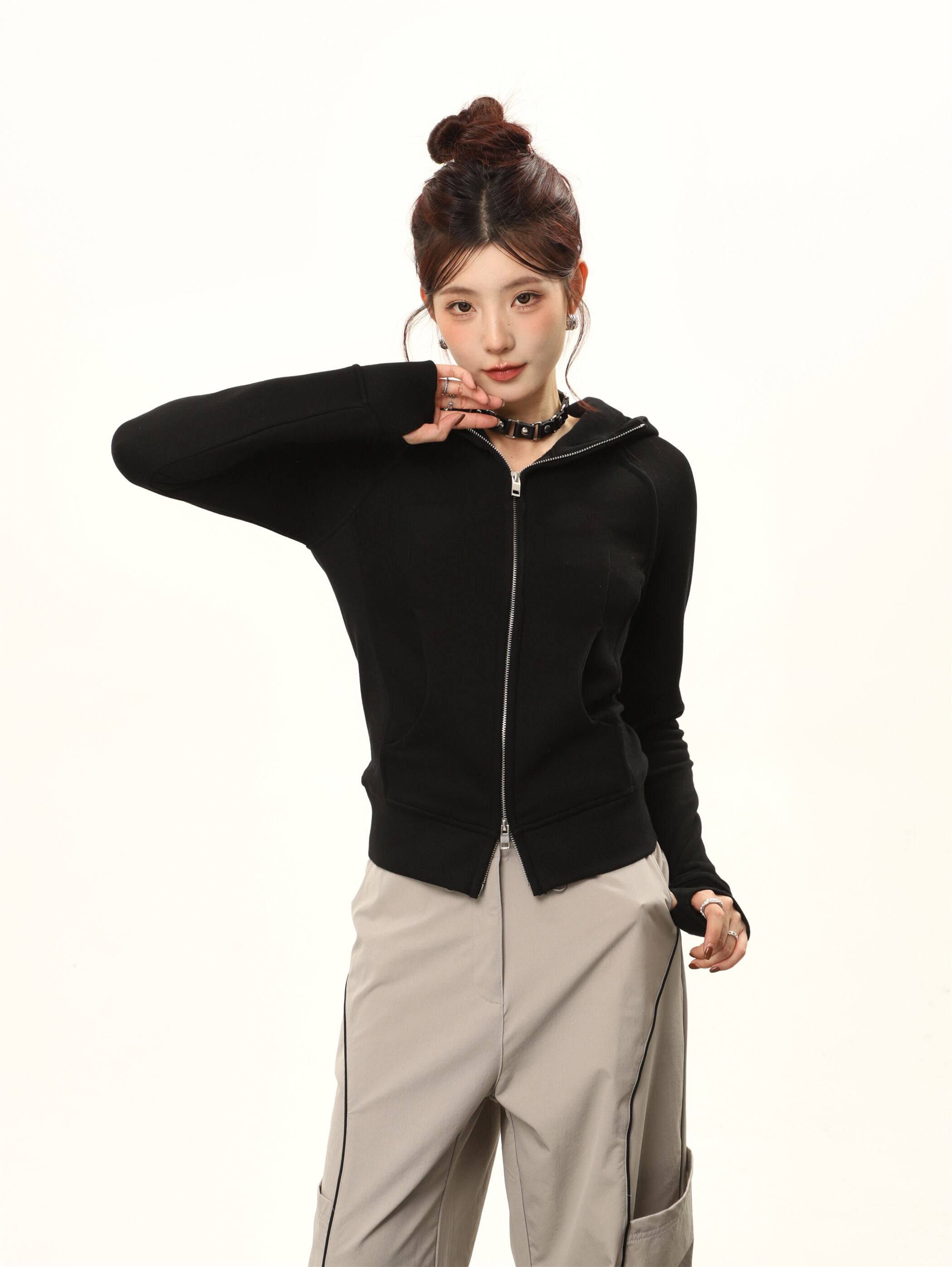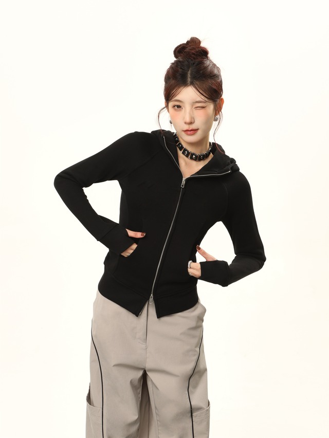ジップアップ仕様で、フード付きの長袖が特徴的なこのブルゾンは、スリムなシルエットで体型を美しく見せます。