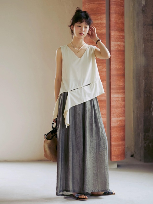 アシンメトリーなシルエットがこなれ感を演出し、ラフなコーディネートにもぴったりです。