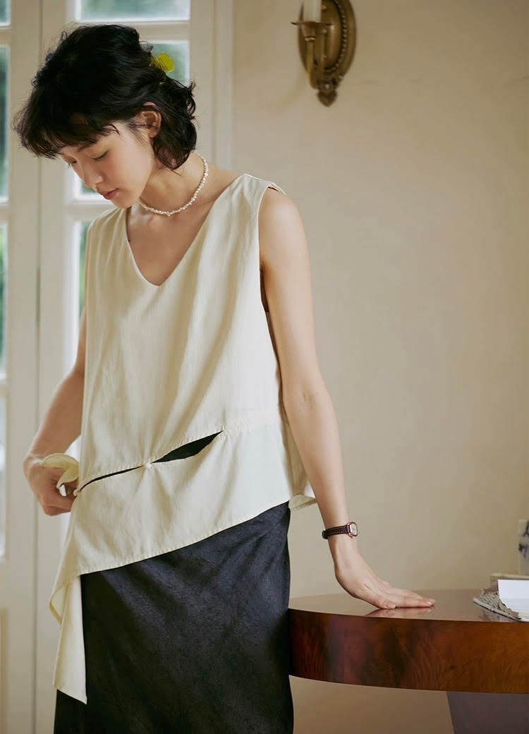 レディース トップス シャツ プルオーバー ノースリーブ Vネック 襟なし アシンメトリー 薄手 かわいい 大人可愛い きれいめ カジュアル 上品 おしゃれ かっこいい レトロ こなれ感 ラフ ルーズ クール モード系 モダン 主役級 存在感 抜け感 都会的 クラシカル ナチュラル 無地 夏 デート お出かけ お泊まり アウトドア 旅行 女子会 休日 バカンス ショッピング 重ね着 韓国 オルチャン コーデ 楽ちん 普段使い モテ 清楚 流行 インスタ映え ゆったり ゆる フリーサイズ ベージュ