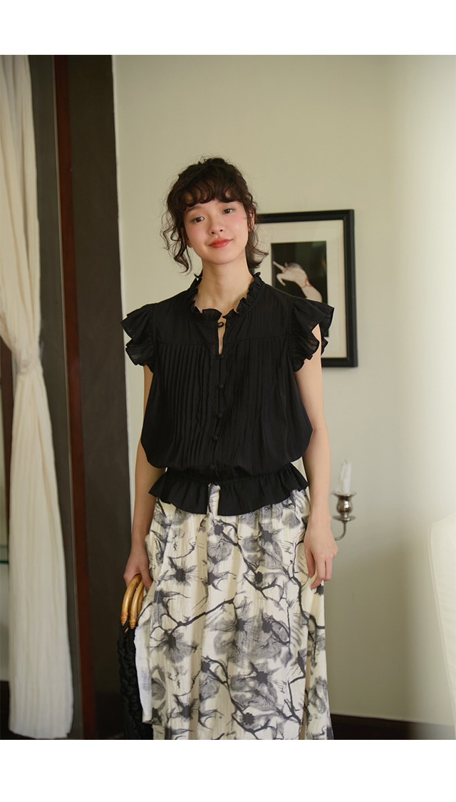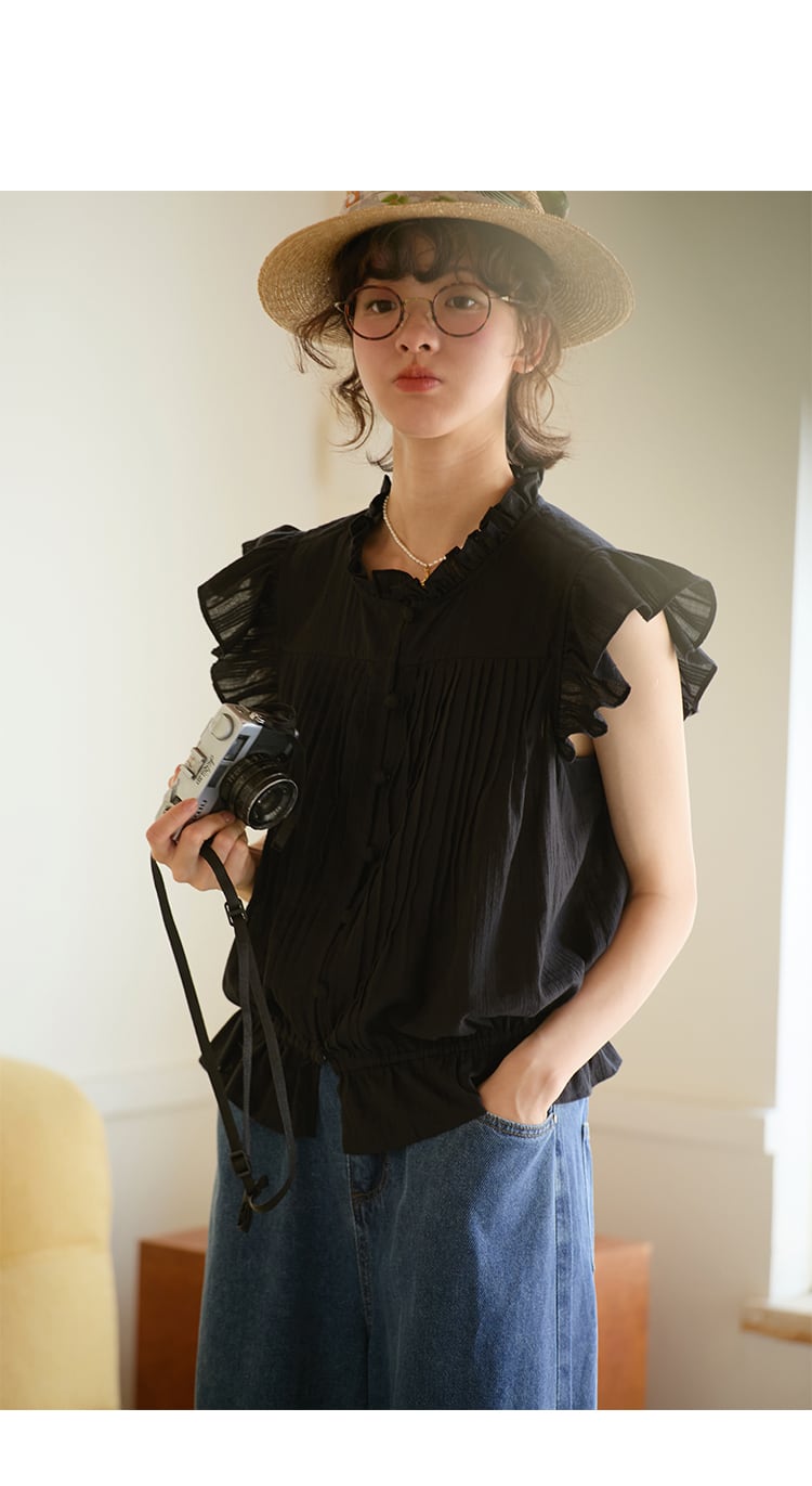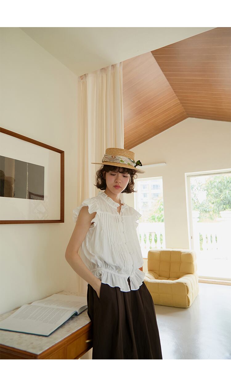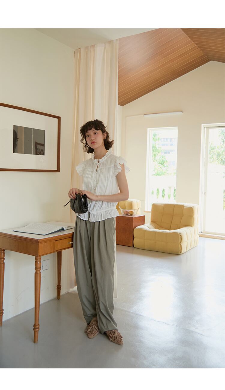 透け感のある薄手素材にプリーツやフリルのディティールが、フェミニンな魅力を演出。