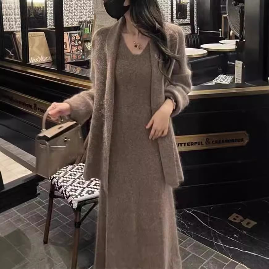 ニット セットアップ 腰ひも付き カーディガン ワンピース 2点セット 上下セット レディース トップス アウター 上着 羽織 ロング マキシ 袖なし ノースリーブ 長袖 Vネック 襟なし ふわふわ 前開き 腰ひも かわいい 大人可愛い きれいめ シンプル カジュアル おしゃれ ラフ 無地 春 秋 冬 ママ 通勤 学生 学校 通学 デート お出かけ 旅行 公園 女子会 休日 ショッピング カフェ 重ね着 暖かい 普段使い 着回し レイヤード フリーサイズ ダークグレー アプリコット コーヒーブラウン
